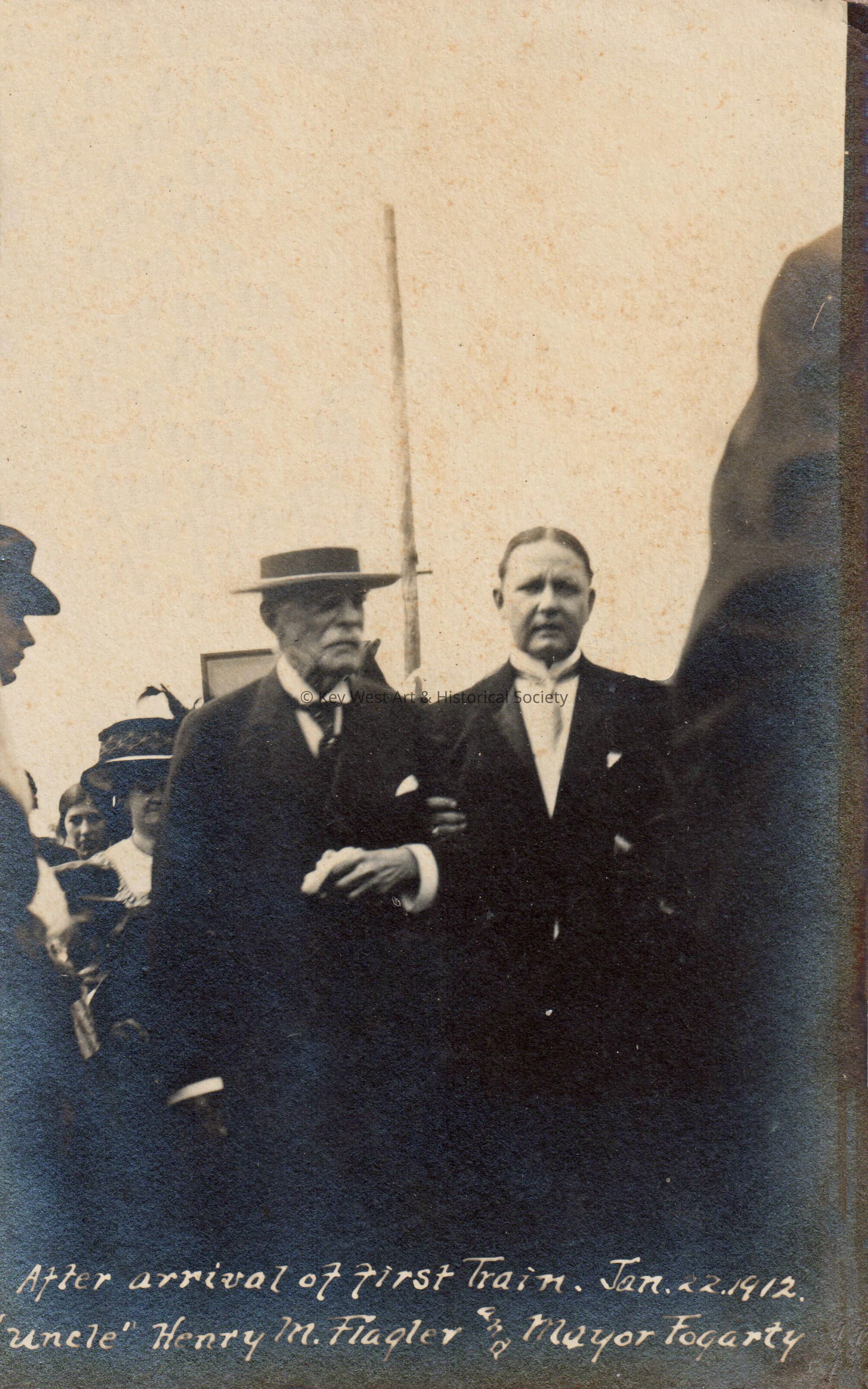Postcard depicting Henry Morrison Flagler and Key West Mayor Joseph Norman Fogarty following the arrival of the first Florida East Coast Railway train to Key West. The caption reads, ‘After arrival of first train, January 22, 1912. “Uncle” Henry M. Flagler and Mayor Fogarty’.Subject Person/Organization