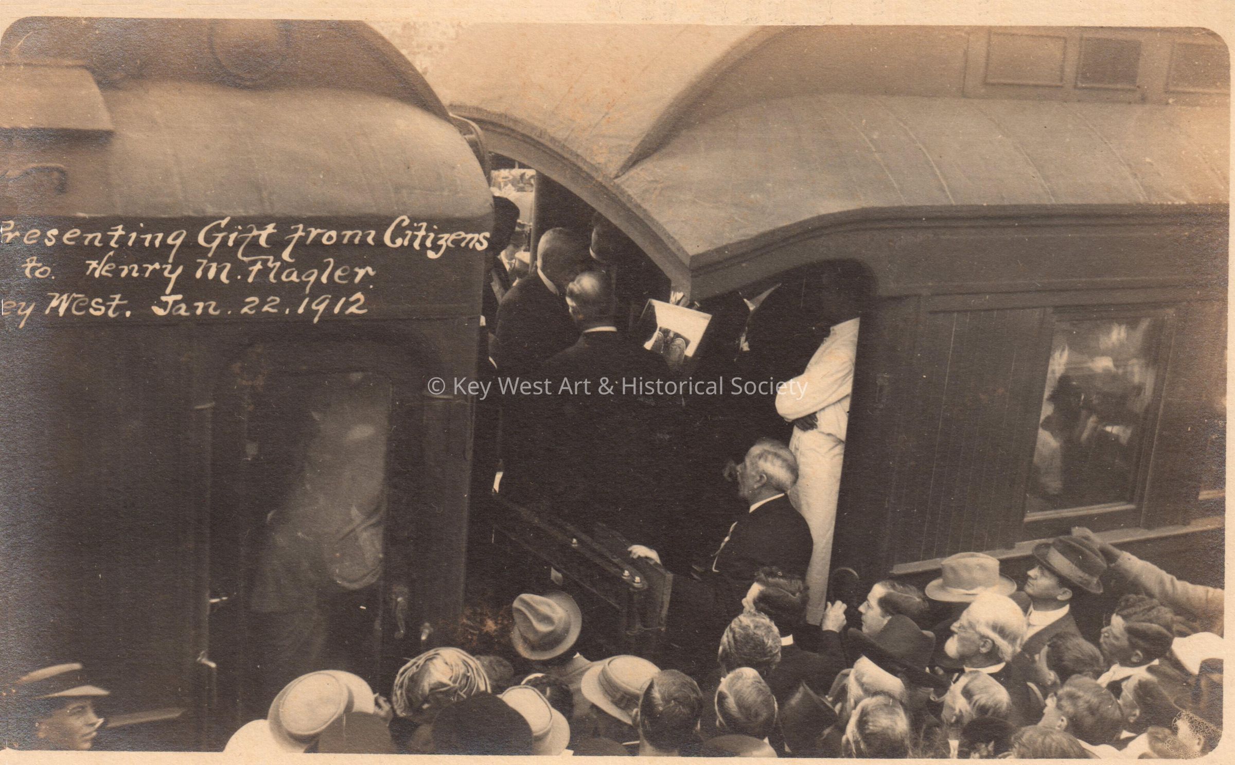 Postcard depicting Henry Morrison Flagler surrounded by a crowd at the rear of the first Florida East Coast Railway train after it arrived in Key West. The caption reads, ‘Presenting gift from Citizens to Henry M. Flagler, Key West, January 22, 1912’.Subject Person/Organization