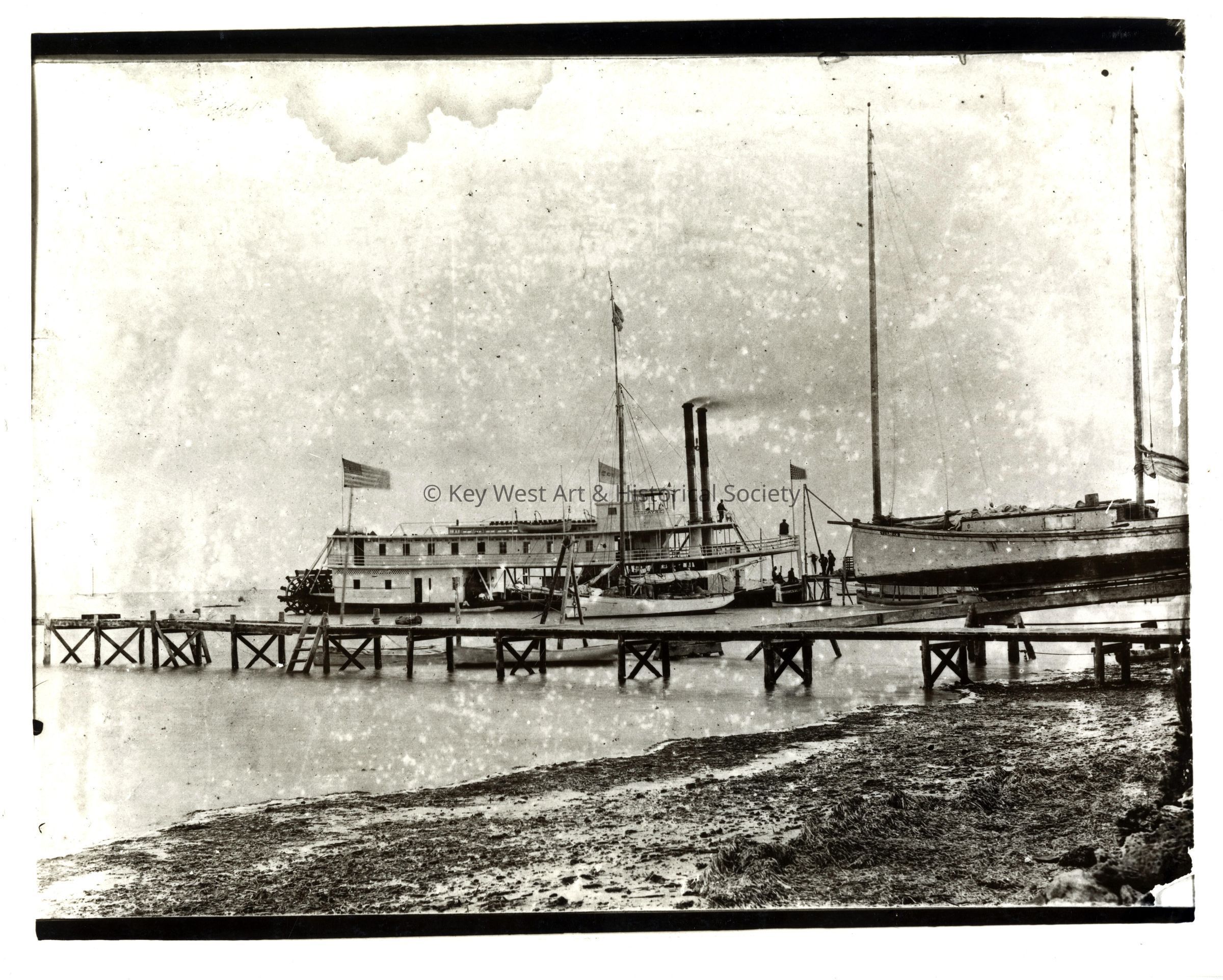 Black and white photograph of Henry Flagler's stern wheel steamer docked at the Factory Wharf.
