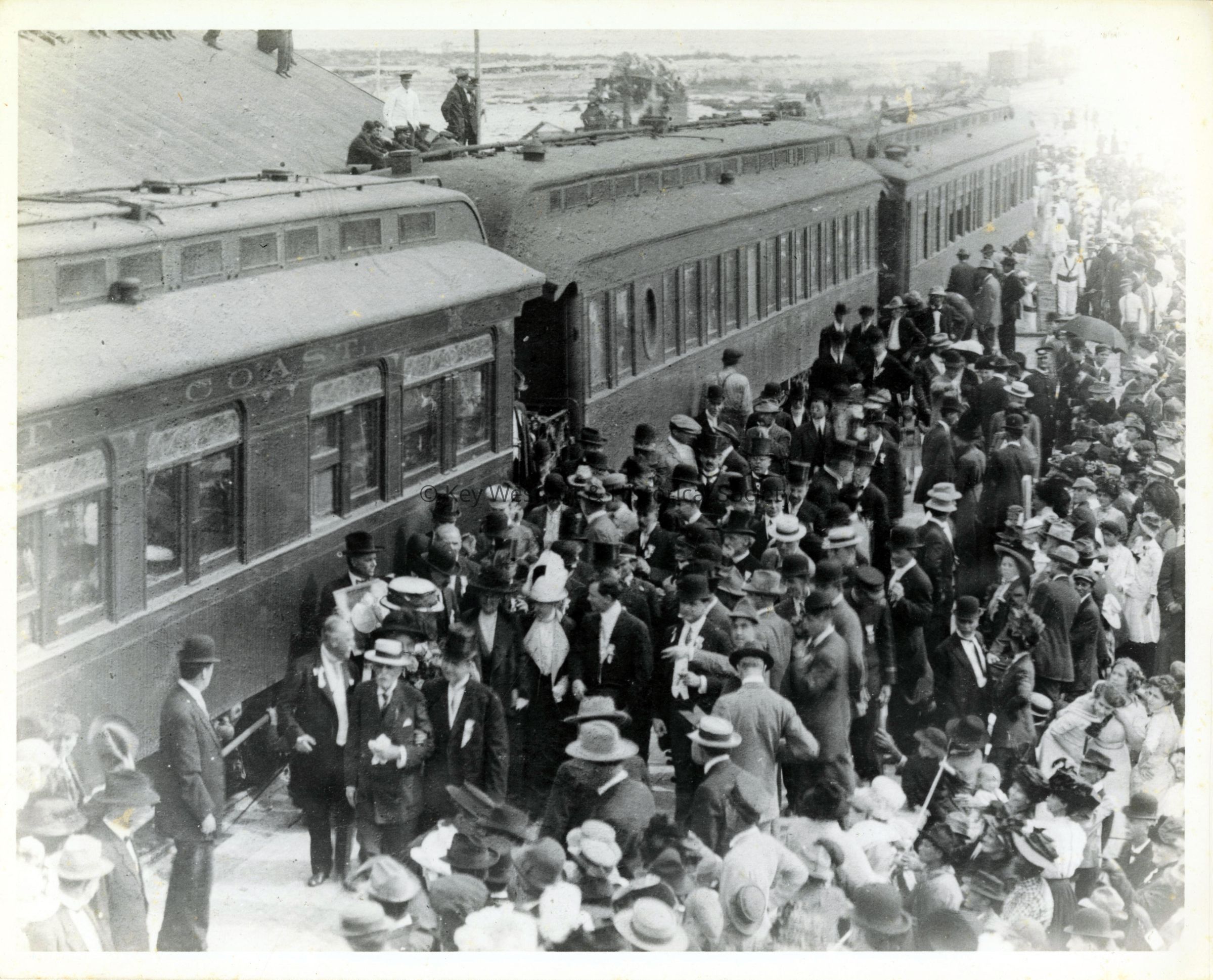 Black and white photograph of Henry Morrison Flagler, Mary Lily Kenan Flagler, and dignitaries taken when the Flaglers arrived on the first Florida East Coast Railway train in Key West.Photograph Details