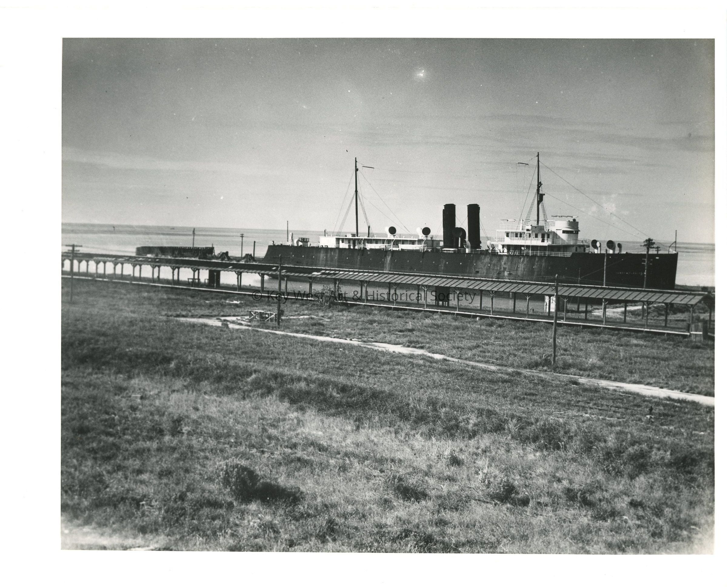 Black and white photograph of the ferry HENRY M. FLAGLER docked in Key West with the Florida East Coast Railway depot in the foreground.