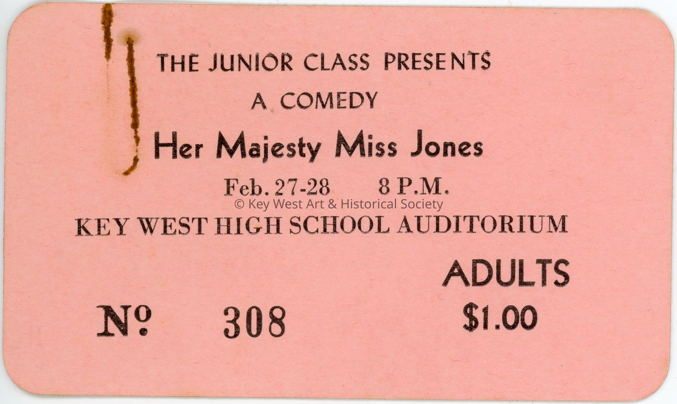 An admission ticket for the play 'Her Majesty Miss Jones' presented by the Junior Class of Key West High School on February 27-28, 1961 staged in the auditorium.Collection