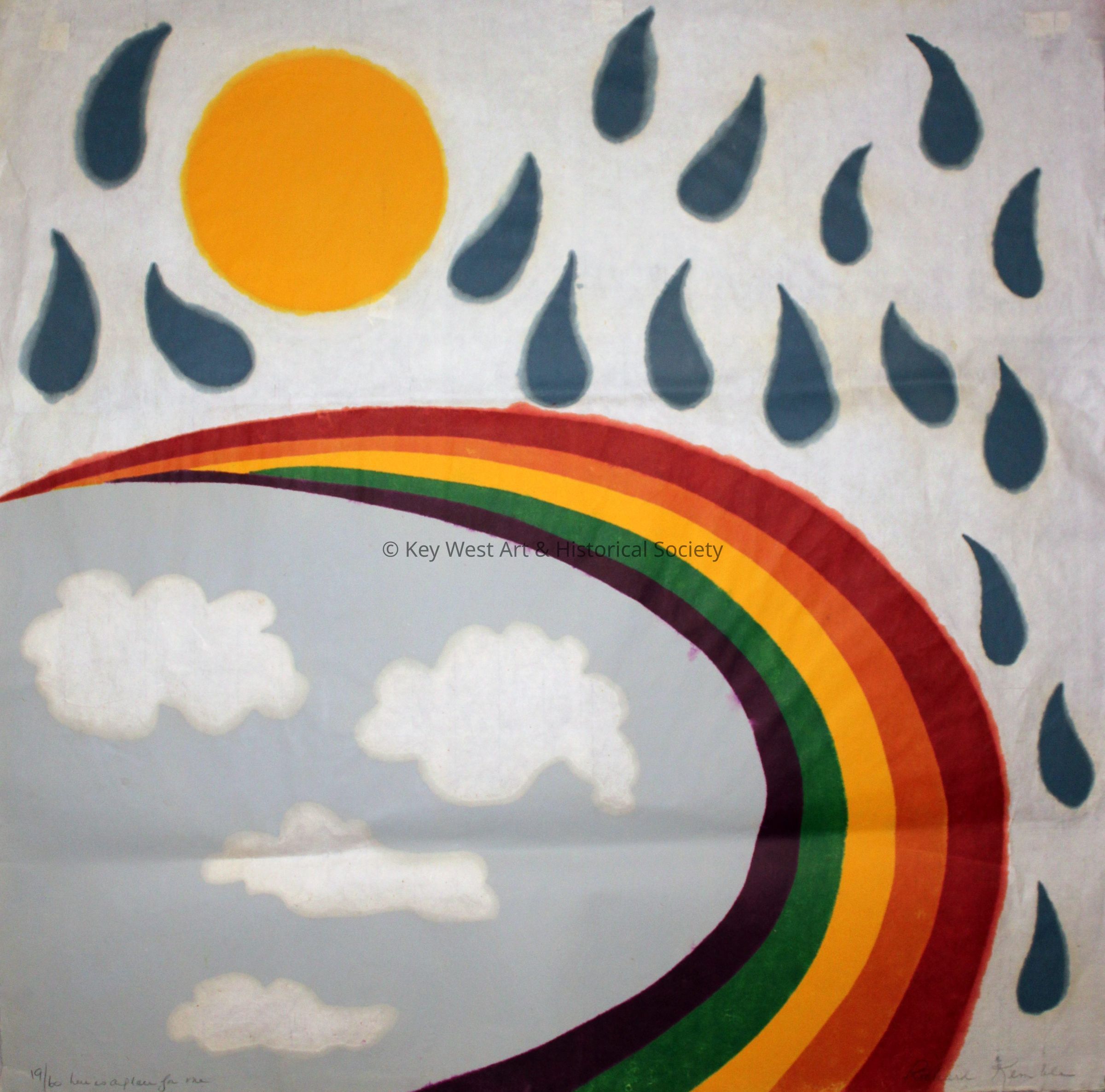 Woodcut by Richard Kemble portraying a vibrant and artistic scene featuring a large, bright yellow sun positioned in the upper left corner, casting a warm and cheerful glow across the composition. Surrounding the upper part of the scene, a series of dark blue raindrops fall from the sky, creating a dynamic contrast with the sun. Beneath this interplay of sun and rain stretches a beautifully arched rainbow, displaying a spectrum of vivid colors from red, orange, yellow, green, and blue to purple. The rainbow majestically spans the scene, separating the sky above from a light gray backdrop beneath. Within this gray area, a few fluffy white clouds are gently scattered, adding a sense of serenity and balance to the overall composition. Numbered 19/60.Type of Print