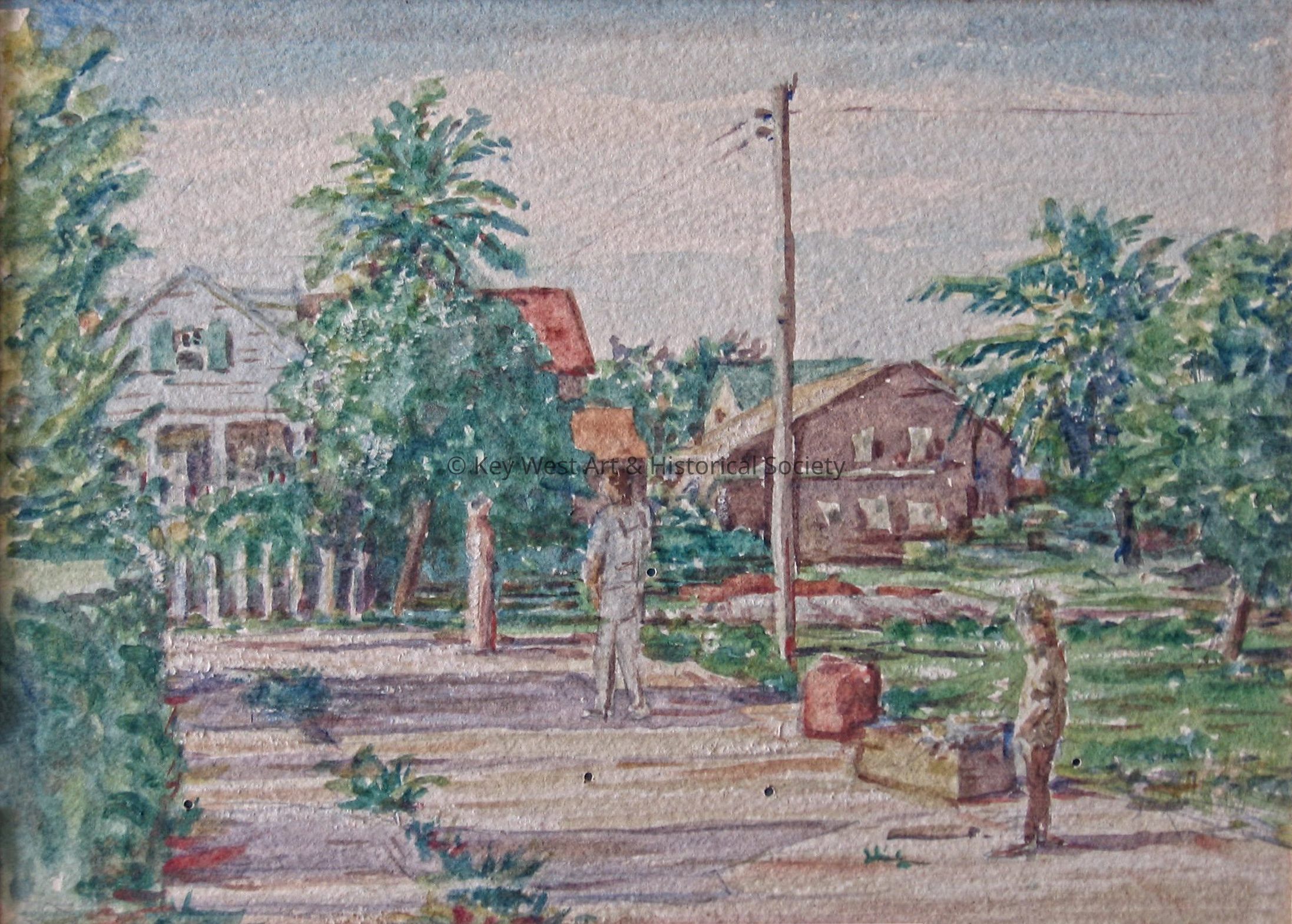 Watercolor by William Greene depicting a small boy watching a sailor walk down the street towards a house.Collection