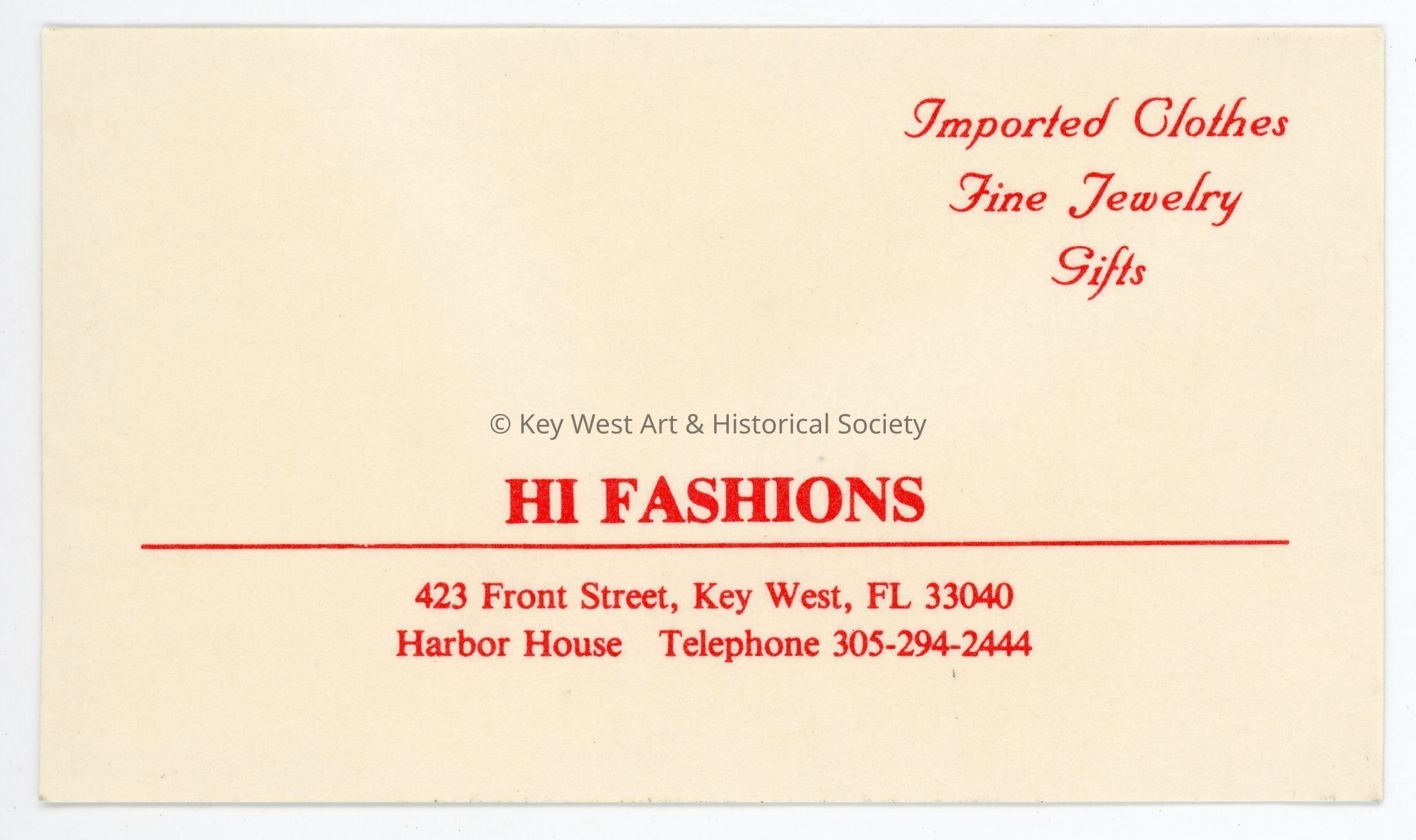 A business card for Hi Fashions store formerly located in the Harbor House building at 423 Front Street.