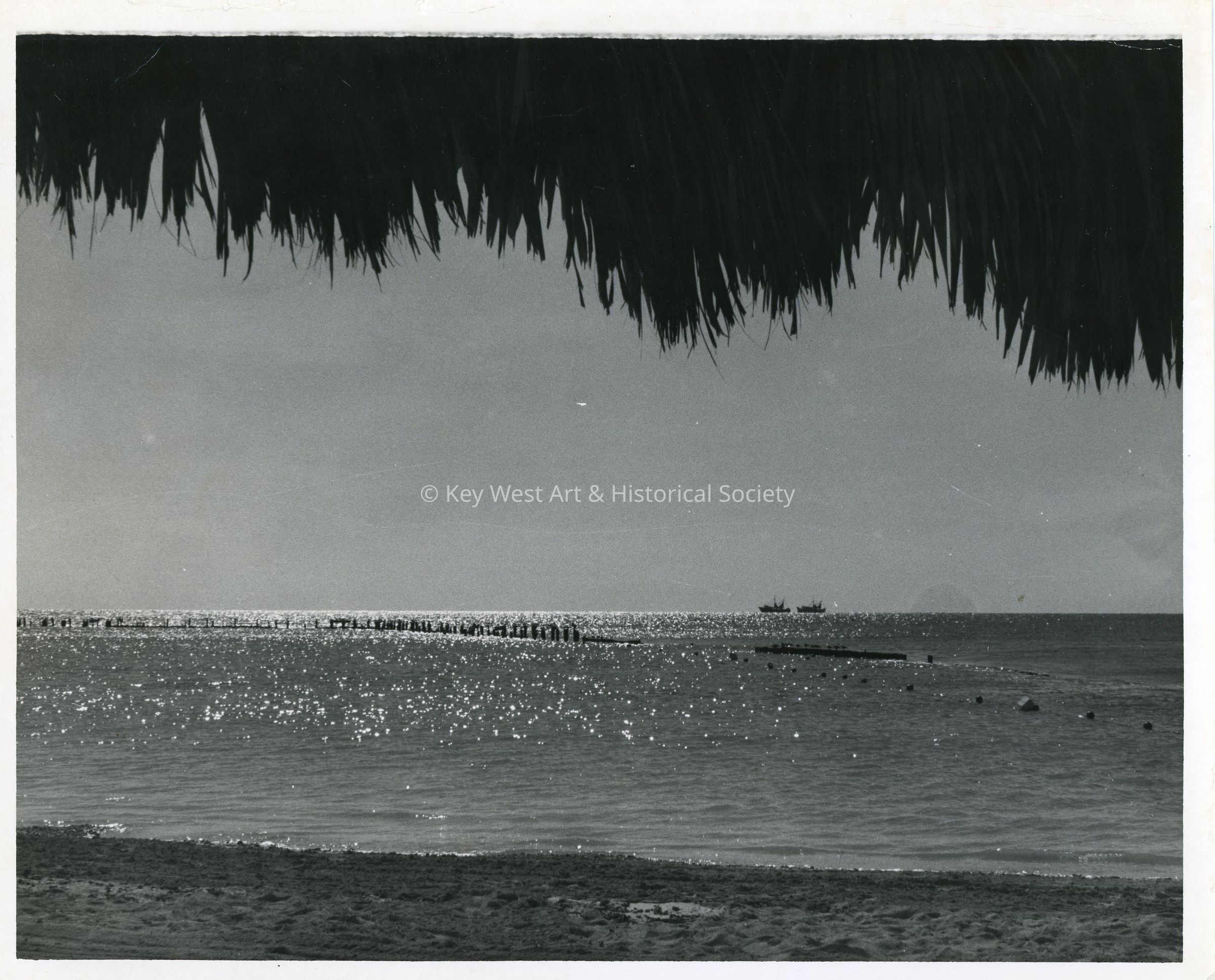 Black and white photograph of Higgs Beach looking out at the remnants of the original Reynolds Pier.