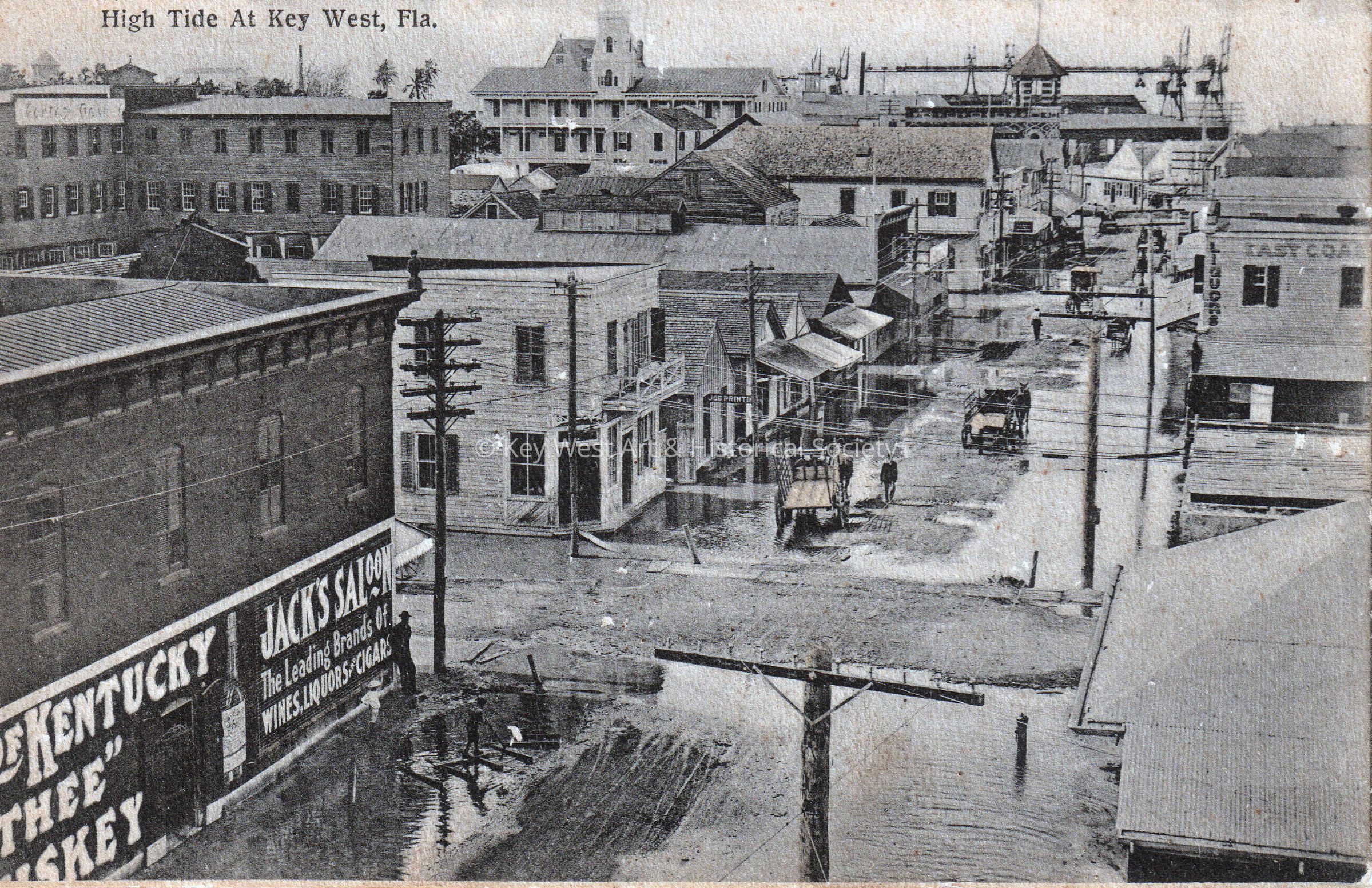 Handcolored postcard depicting tidal water in the business district of Key West, looking west down Front Street from the corner of Simonton Street. Wagons and people are visible on the flooded streets with ships in dock in the background. The caption reads, ‘High Tide at Key West, Florida.'Subject Place