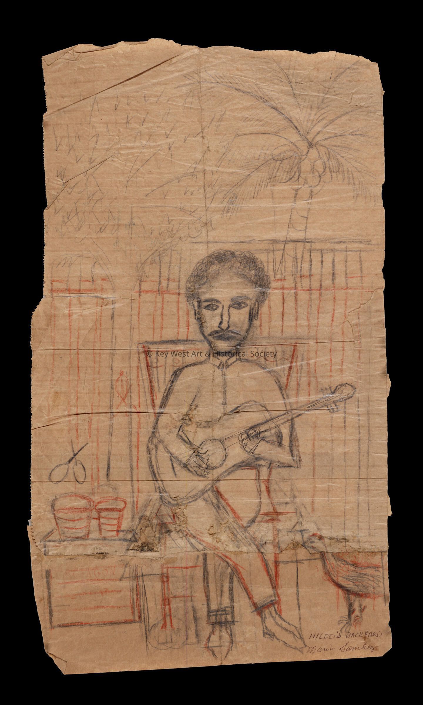 Pencil drawing on an unfolded paper bag by Mario Sanchez depicting Hildo with a guitar in his hand.Type of Drawing