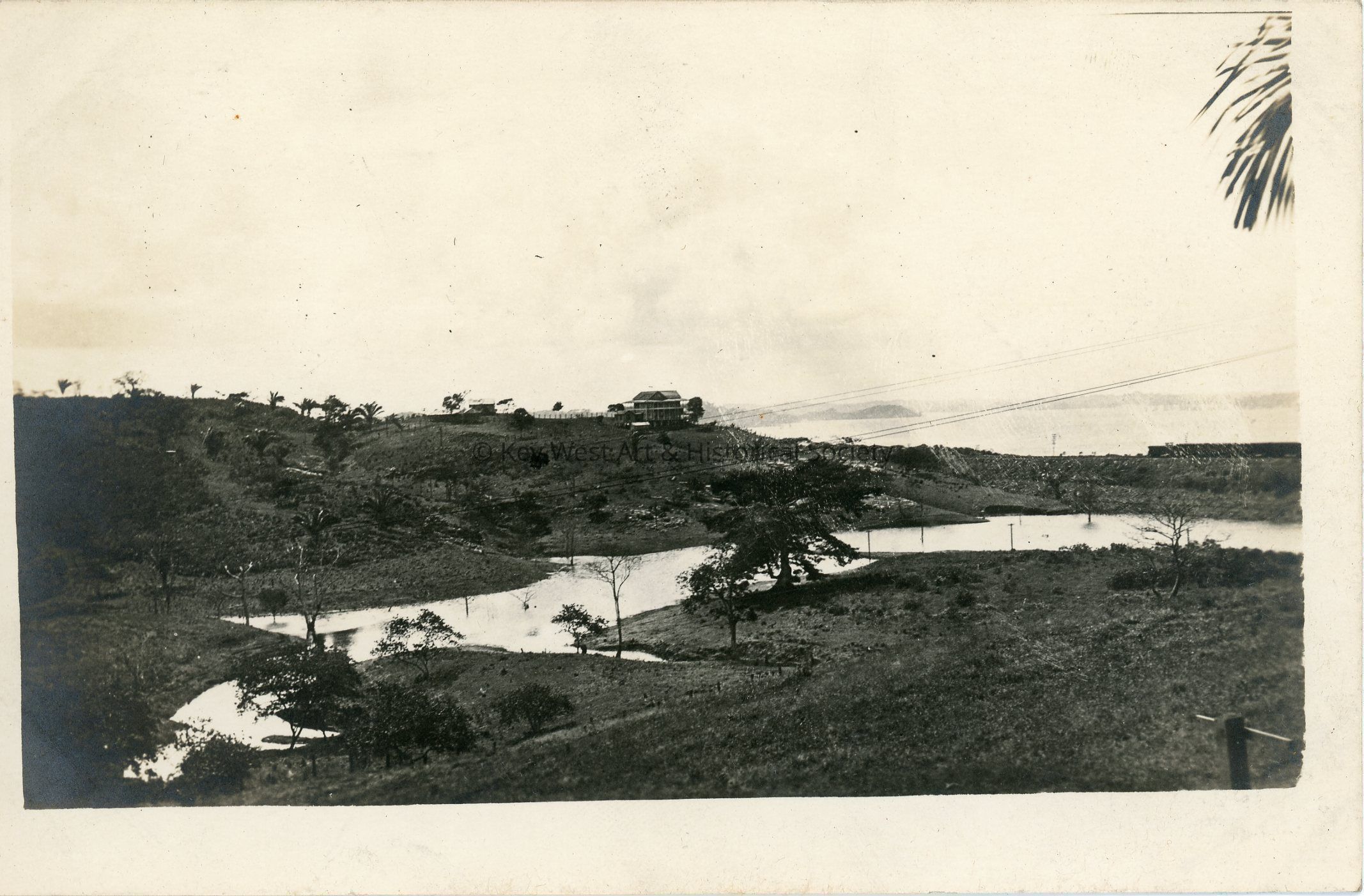 Black and white photograph postcard depicting the hills around Gatun Lake. A house can be seen in the background. The postcard is addressed to Mrs. G.A. Balling.Subject