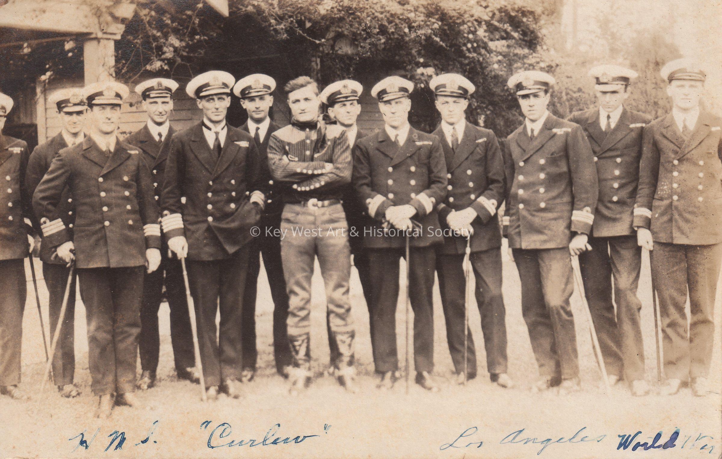 Postcard of a group of officers with canes and a man dressed as a cowboy. Written on the front of the card is, ‘HMS “Curlew” Los Angeles, World War’. Writing on back reads, ‘HMS “Curlew” Tom Mix with Captain & officers, Los Angeles.’Collection
