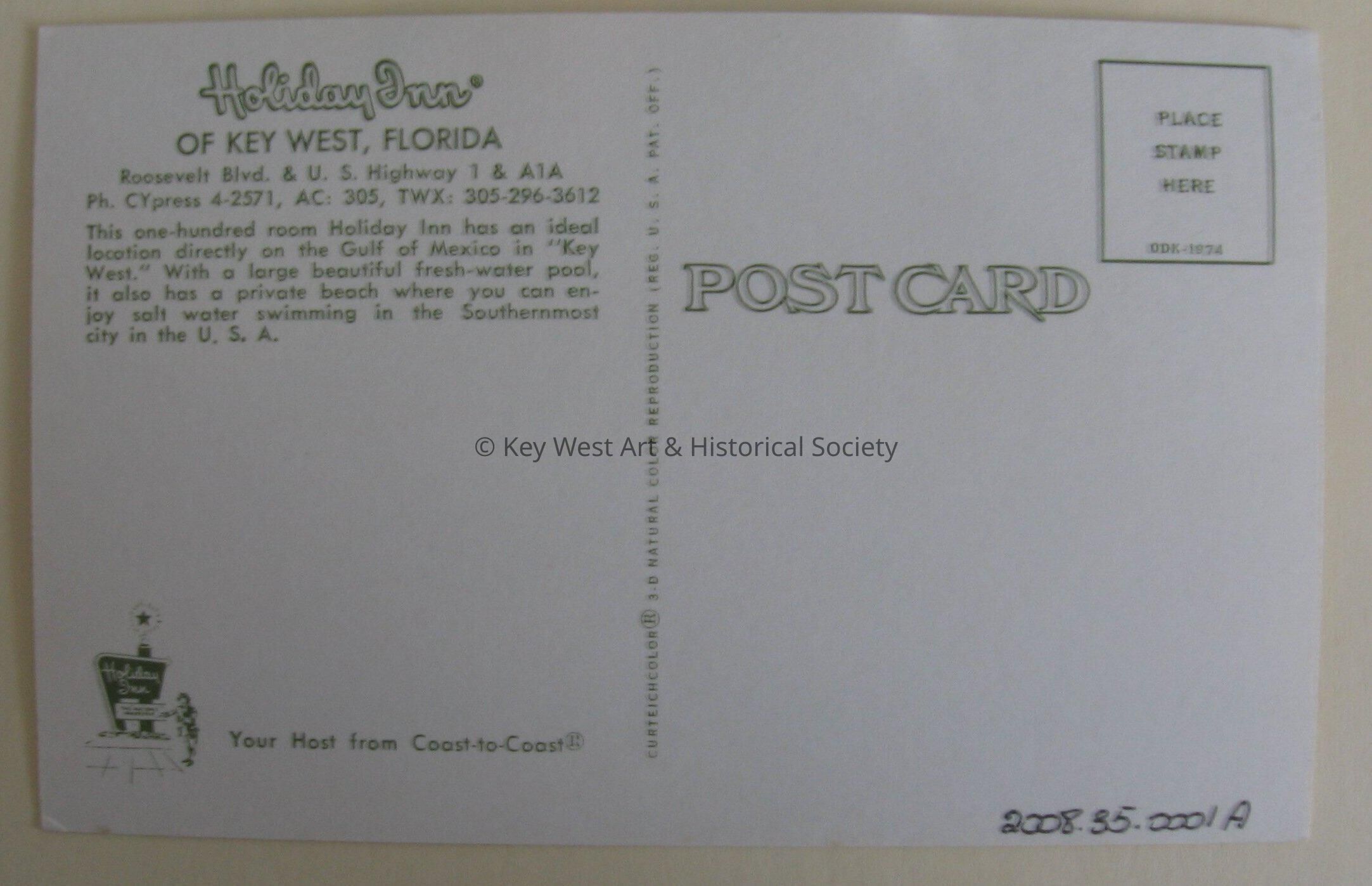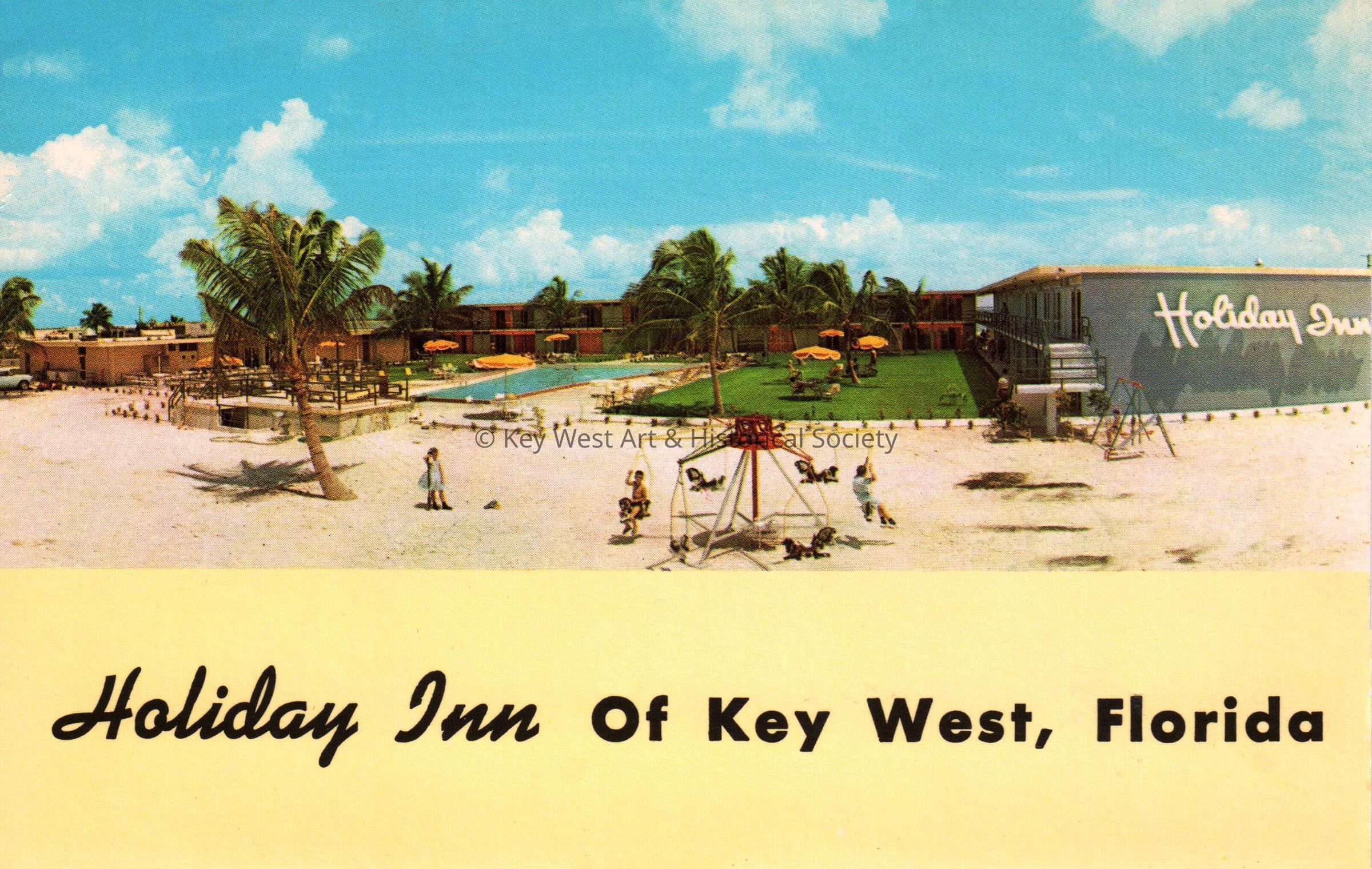 Postcard depicting children playing on swings, and a pool near a Holiday Inn. The caption reads, ‘Holiday Inn of Key West, Florida’. Notation on verso, 'Holiday Inn of Key West, Florida, Roosevelt Boulevard and U.S. Highway 1 and A1A. This one-hundred room Holiday Inn has an ideal location directly on the Gulf of Mexico in "Key West." With a large beautiful fresh-water pool, it also has a private beach where you can enjoy salt water swimming in the Southernmost city in the U.S.A. Your host from Coast-to-Coast.'Subject Place