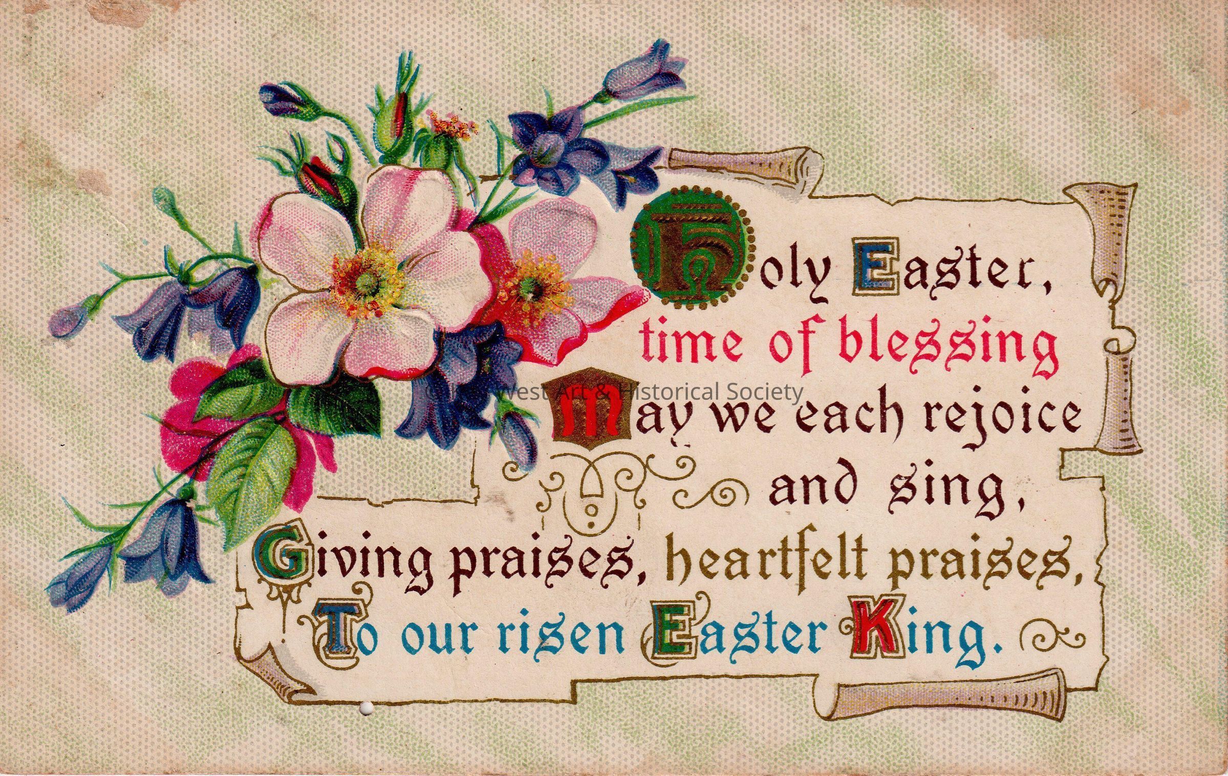 Postcard depicting flowers and a caption that reads, ‘Holy Easter, Time of Blessing, May we each rejoice and sing, Giving praises, heartfelt praises, To our risen Easter King.’ The message on the verso reads, ‘Stuart Family'. The card is addressed to Mr. and Mrs. J.W. Hattrick, 2113 Manton Street, Philadelphia, Pennsylvania.Collection