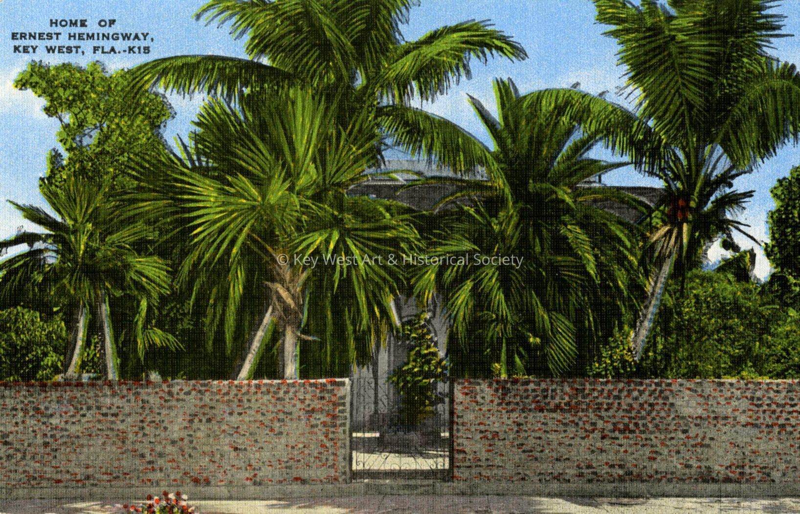Postcard depicting the Ernest Hemingway house at 907 Whitehead Street. The caption reads, ‘Home of Ernest Hemingway, Key West, Fla.’ Notation on verso, ‘The breezes reach Key West over miles of sparkling turquoise and indigo waters, hence pure, clean, and balmy. The sun's rays shine unfiltered by dust or fumes. The air is untainted crystal.’Subject Person/Organization