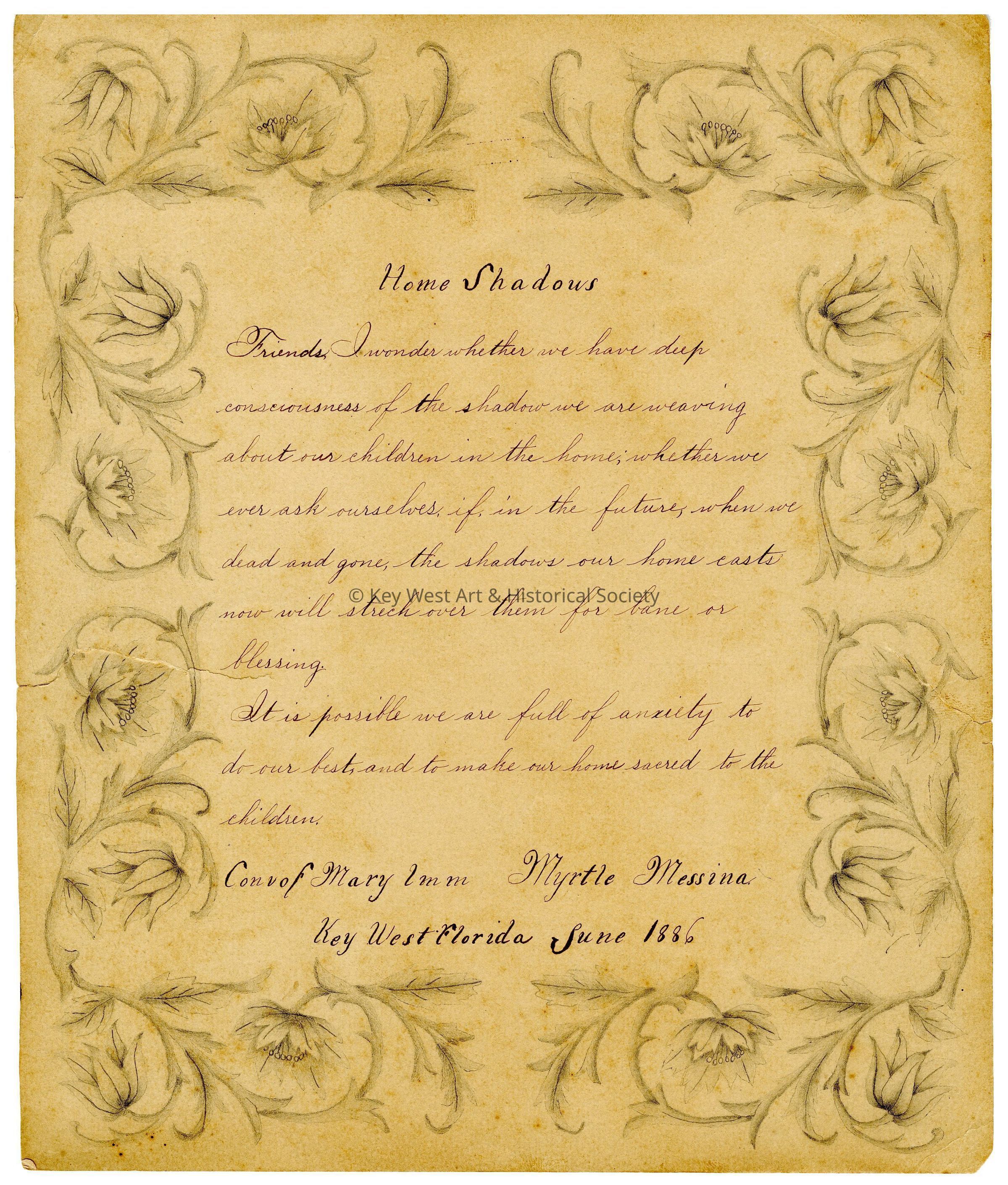 Handwritten poem titled 'Home Shadows' that was written by Myrtle Messina when she was a student at the Convent of Mary Immaculate. The paper's border has elaborately drawn flowers.