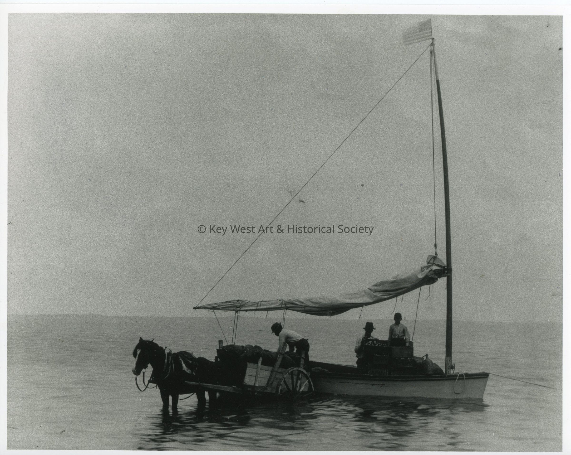 Black and white photograph of man loading goods from a coastal trader into horse drawn carriage to be taken to shore.