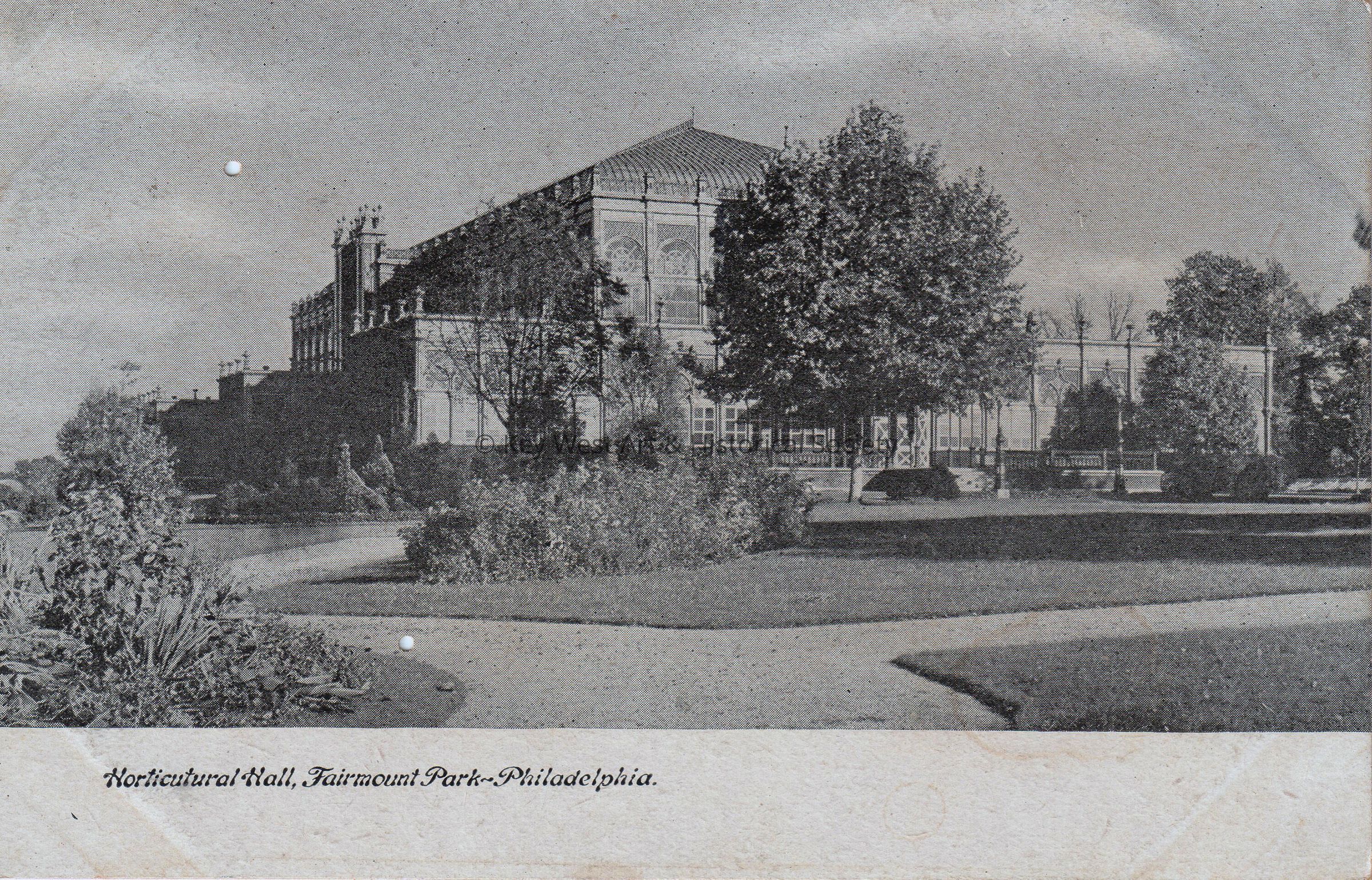 Postcard depicting a large building amidst foliage. The caption reads, ‘Horticultural Hall, Fairmount Park, Philadelphia.’Collection