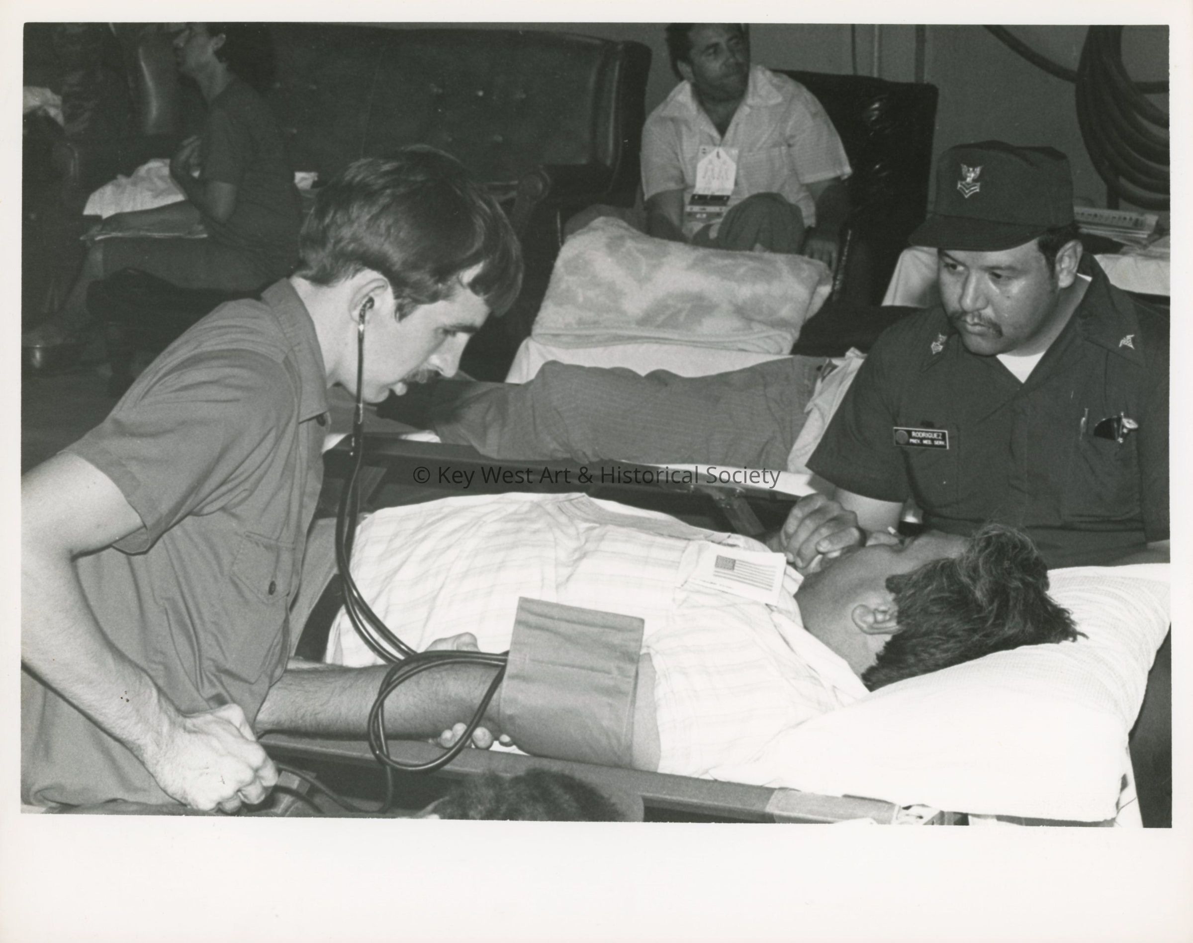 Black and white photograph of hospital corpsman, Furness, provides medical care to a Cuban refugee at the Trumbo Point Cuban Refugee Center as HM Rodriguez observes.