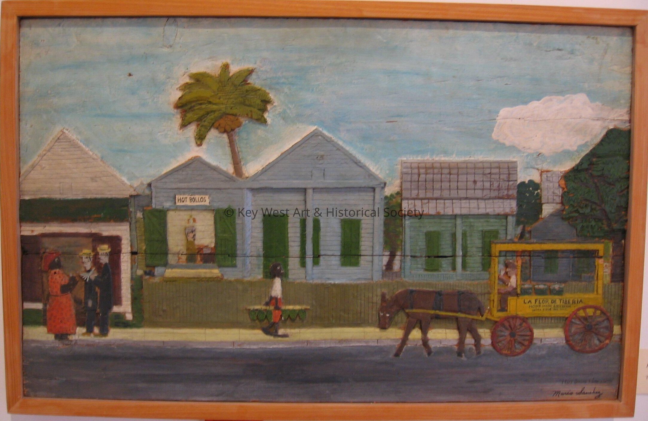 Wood carving by Mario Sanchez depicting a typical street scene of hot Bollo vendor, a Spanish lime vendor, and the Tiberia ice cream wagon pulled by a horse. The woodcarving appeared in the background of the movie ‘That Touch of Mink’ when the carving was owned by Cary Grant.Type of Sculpture