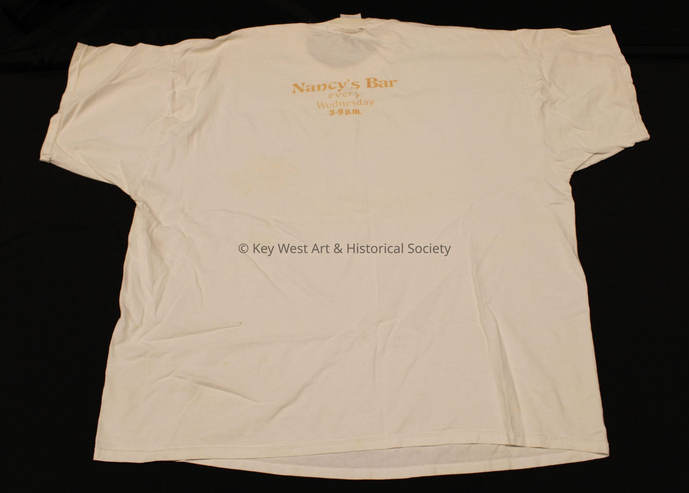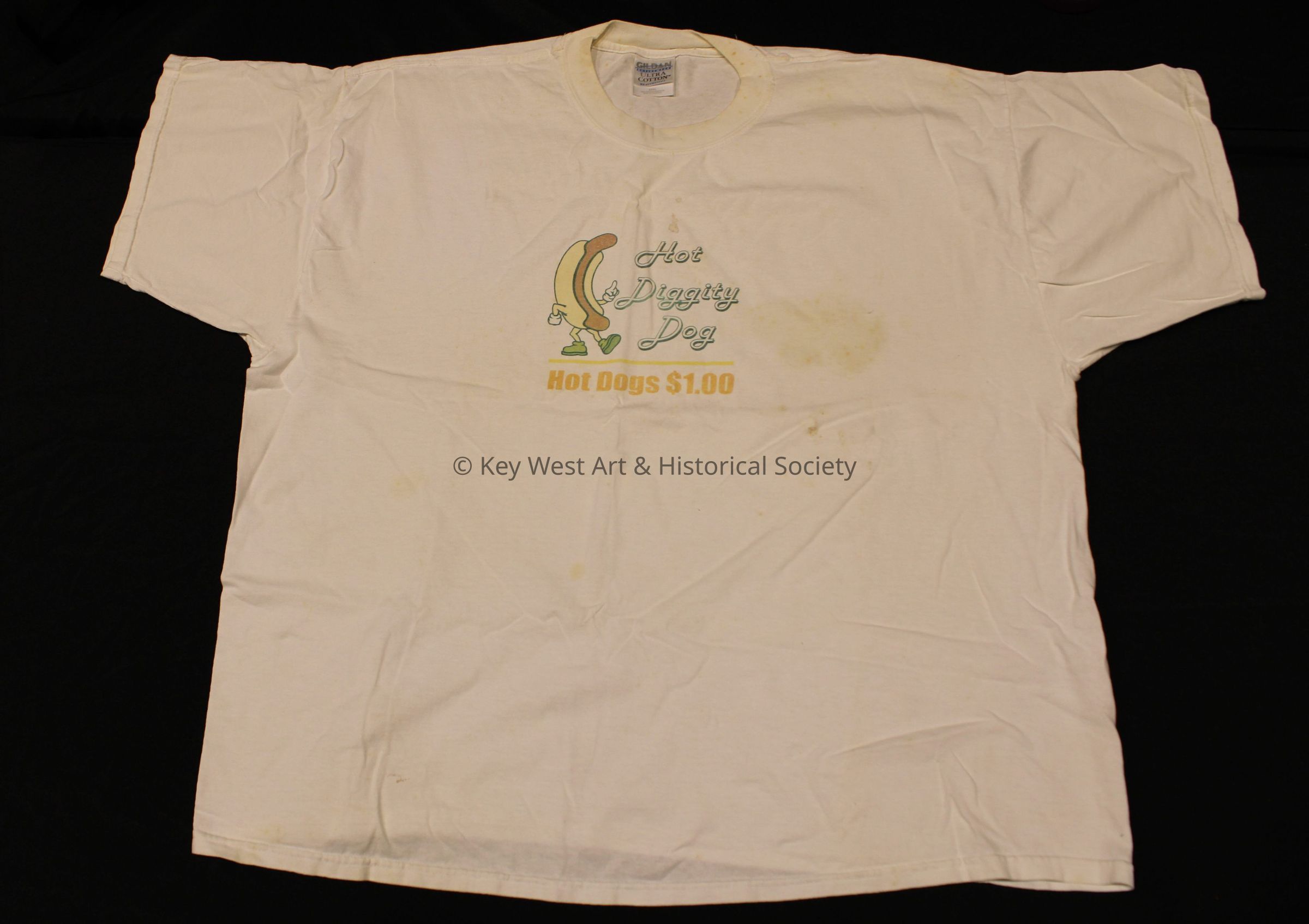 Cotton short sleeved shirt with "Hot Diggity Dog / Hot Dogs $1.00" on the front and "Nancy's Bar every Wednesday 3-9 p.m." on the back.