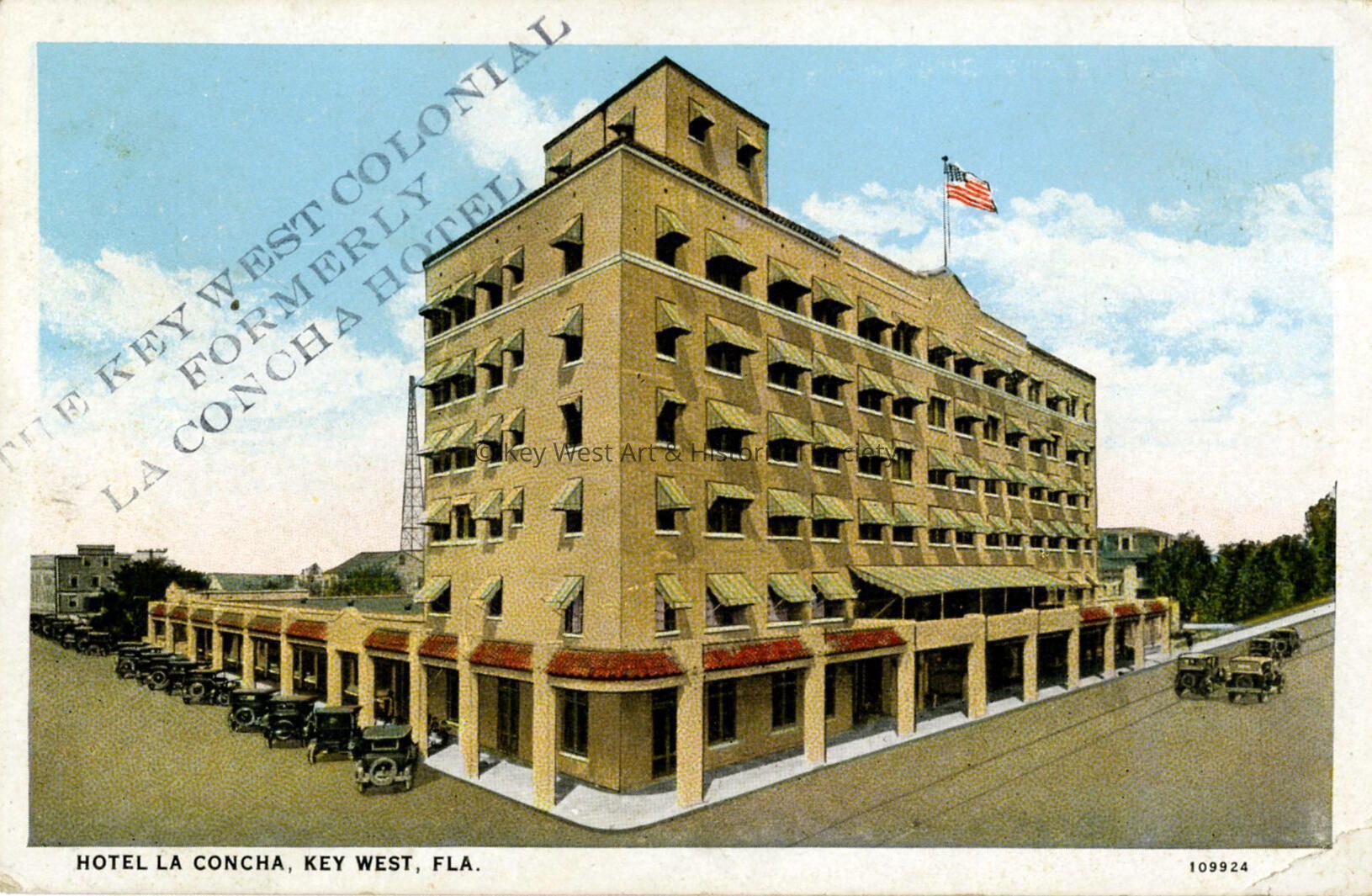 Postcard depicting the La Concha Hotel at 430 Duval Street. The caption reads, 'Hotel La Concha, Key West, Fla.' There is an inked stamp across the front of the card that reads, 'The Key West Colonial formerly La Concha Hotel.'Subject Place