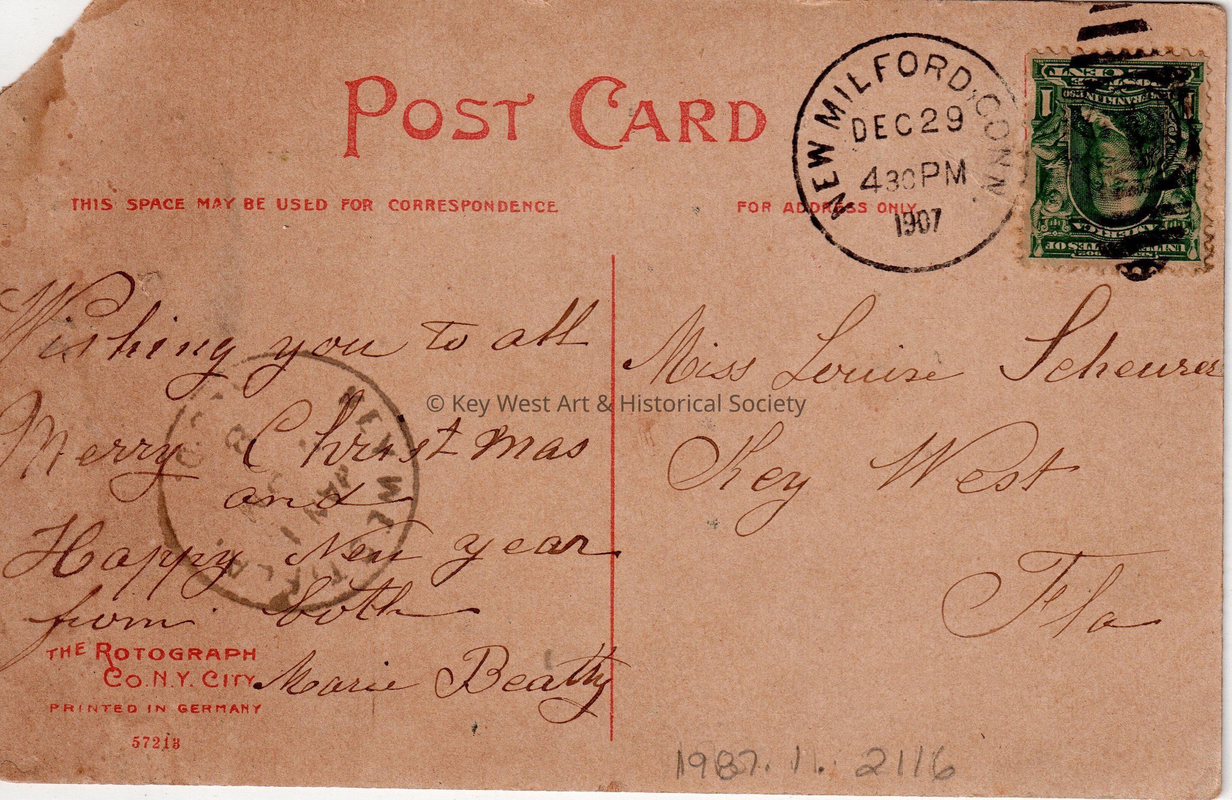 Postcard depicting a bridge over a river. The caption reads, ‘Housatonic River & Bridge, New Milford, Connecticut.’ The message on the verso reads, ‘Wishing you to all Merry Christmas and Happy New Year. From Both, Marie Beatty.’ The card is addressed to Miss Louisa Scheurer, Key West, Florida, and is postmarked New Milford, Connecticut, December 29, 1907.Subject Place