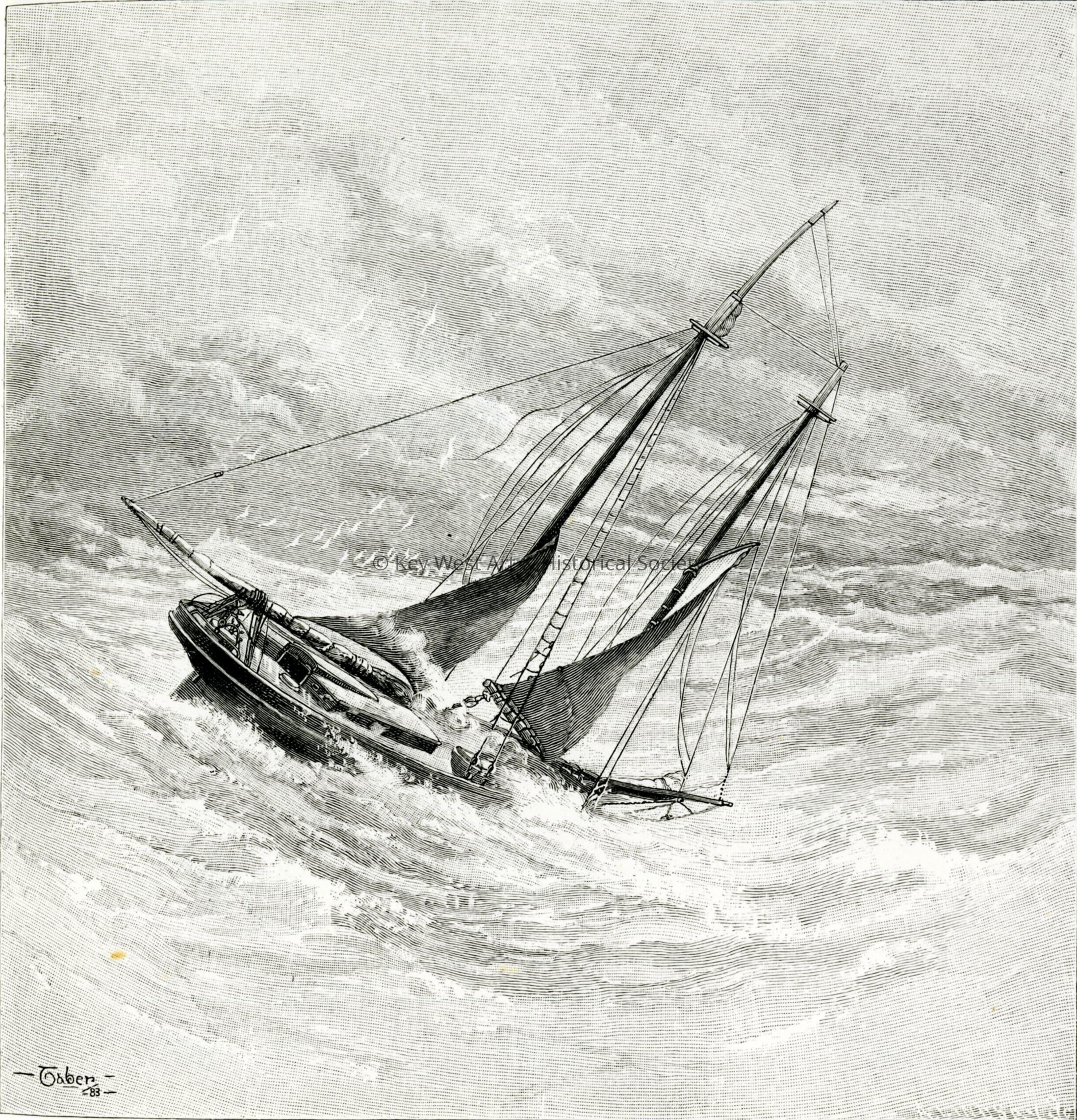 Black and white photograph taken from an illustration entitled 'Hove To' from The Century Illustrated Monthly Magazine, October 1886. Illustration used to depict the wrecking industry and a wrecking schooner in heavy weather.