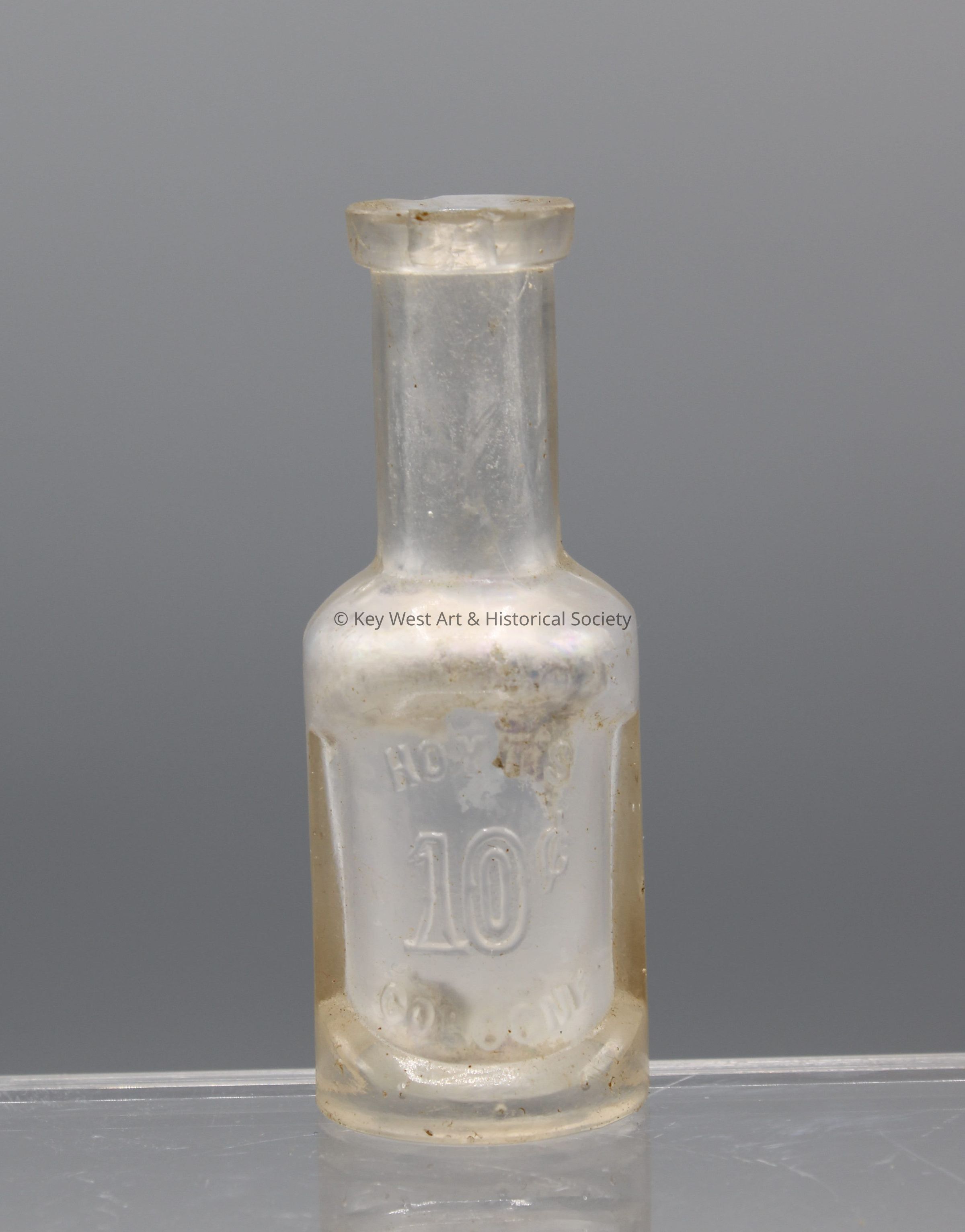 Small colorless glass bottle with embossing on one face reading 'Hoyt's / 10¢ / Cologne.'