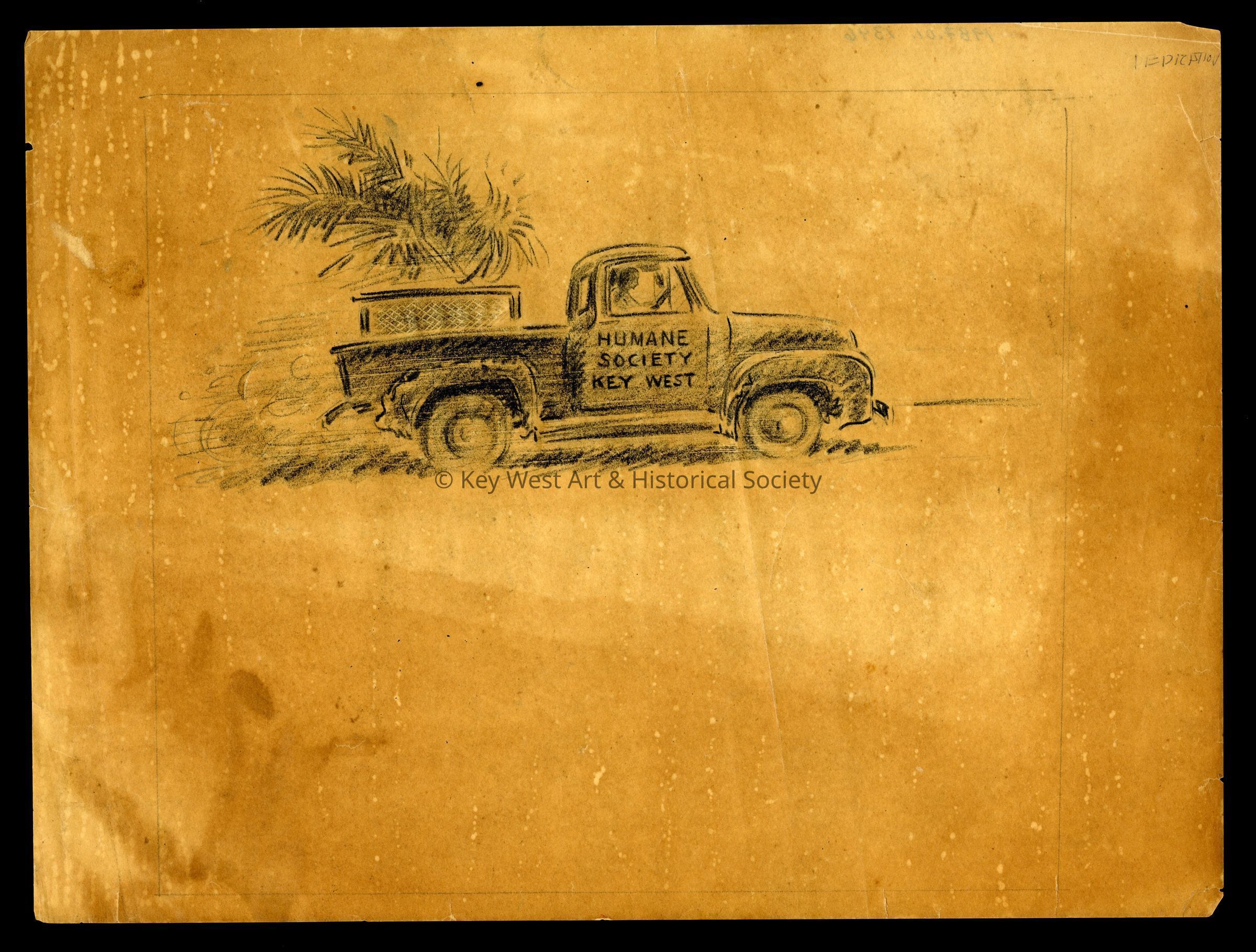 A charcoal sketch on paper created by Morgan Dennis. The sketch depicts a pickup truck belonging to the Humane Society Key West.Type of Drawing