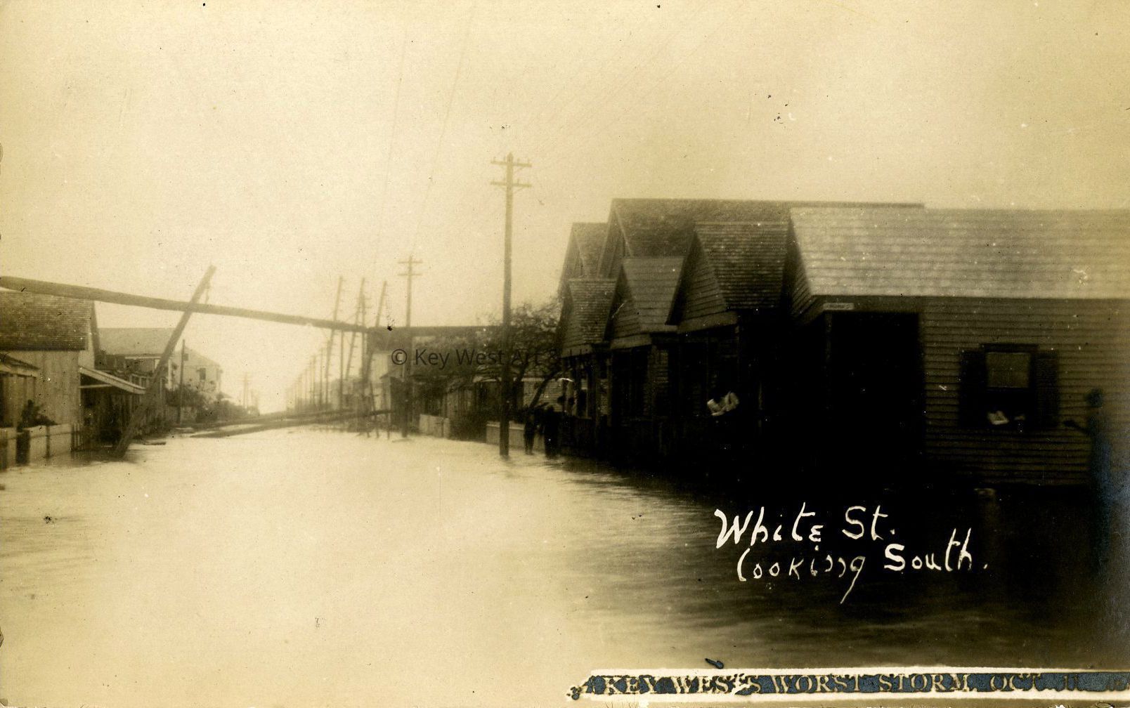 Photograph postcard depicting the destruction at White Street looking south as a result of the 1909 Hurricane.