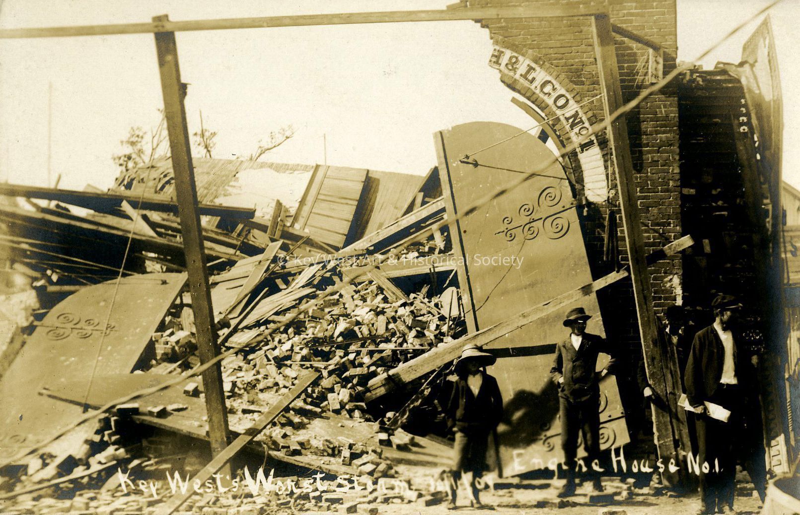 Photograph postcard depicting the destruction at the Key West Fire Station No. 1 as a result of the 1909 Hurricane.