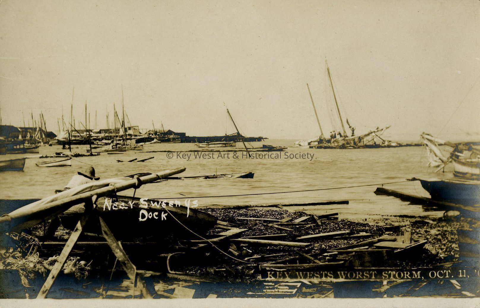 Photograph postcard depicting the destruction at the Key West Bight near Sweeny's Dock as a result of the 1909 Hurricane.