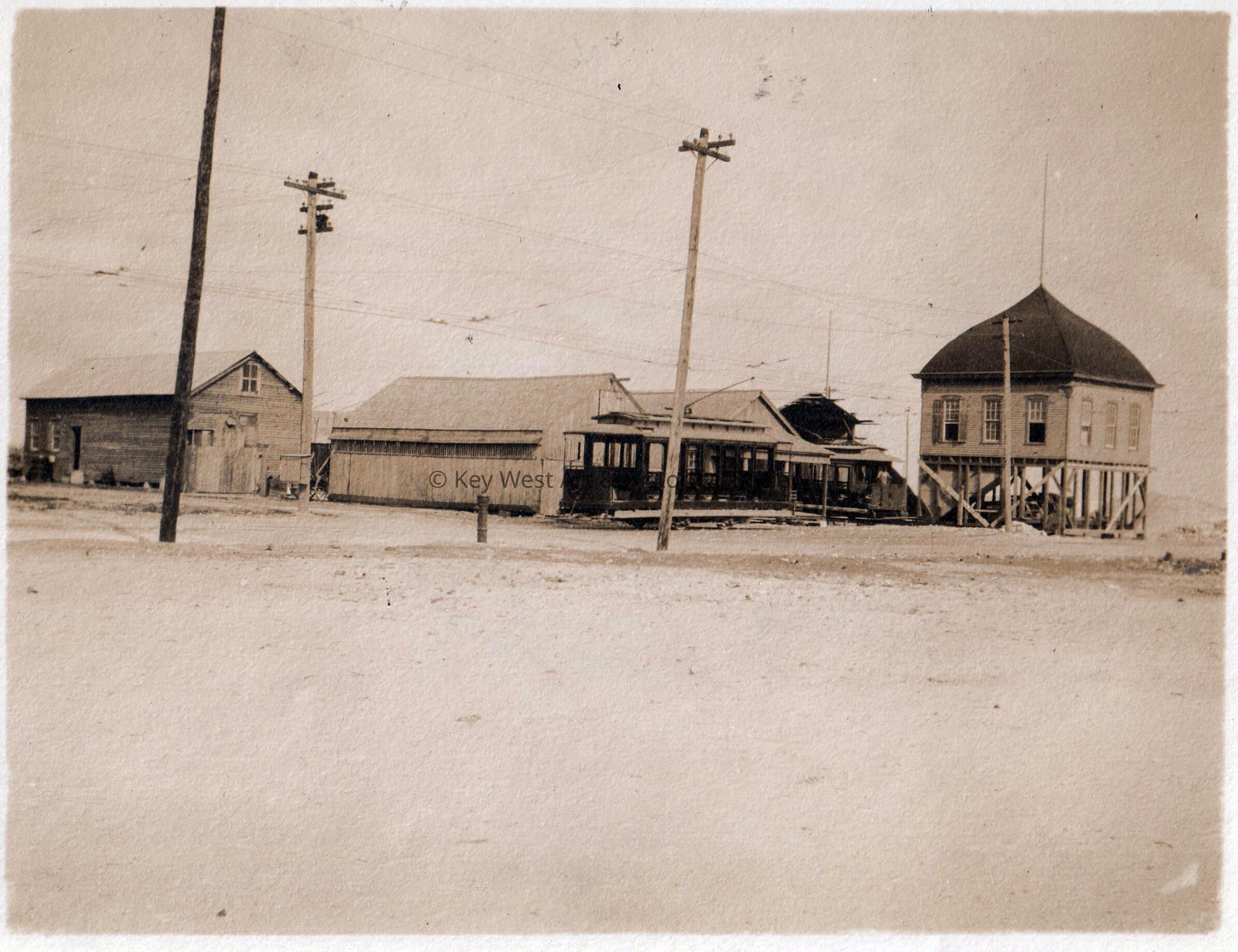 Black and white photograph of La Brisa at the end of Simonton Street taken after the 1910 hurricane showing the storm damage. Structural and window damage on the street car shed is visible.