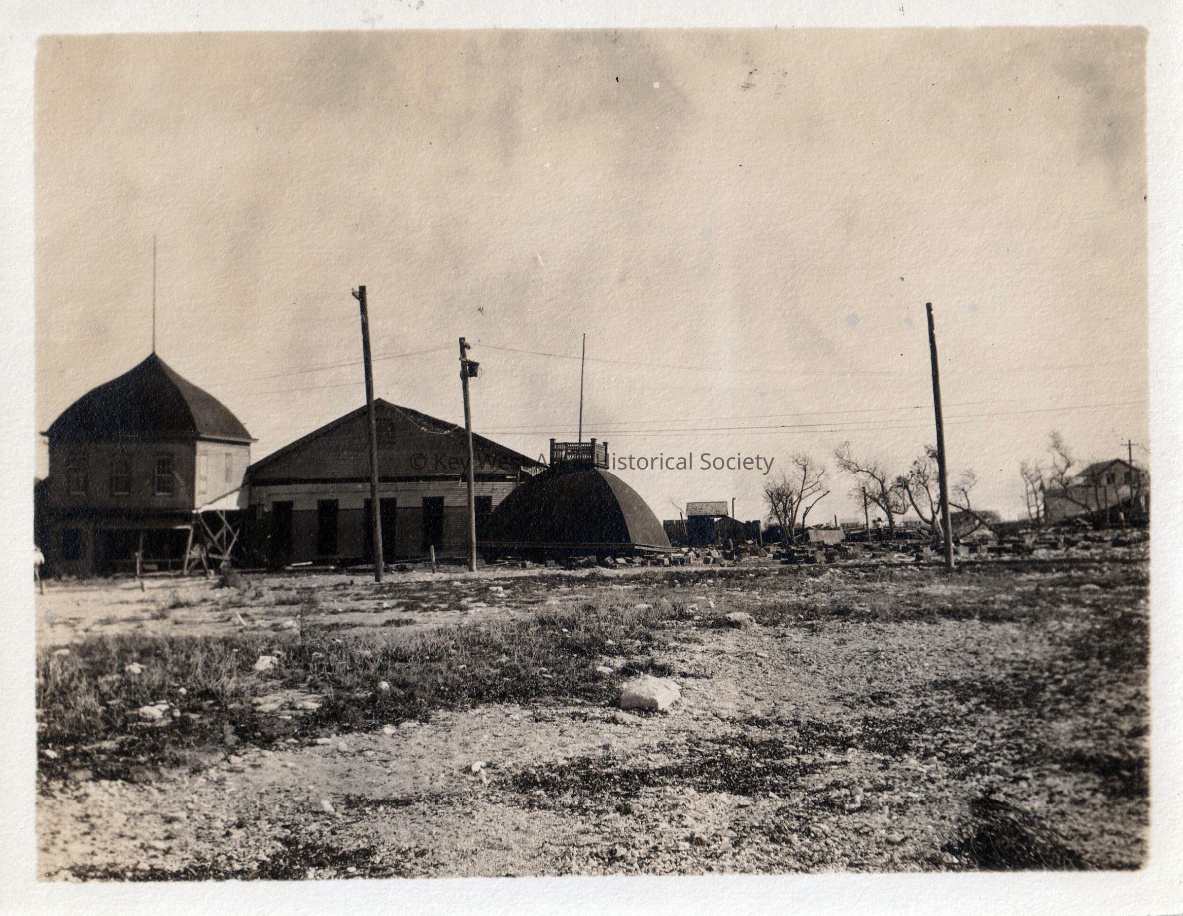 Black and white photograph of La Brisa at the southern end of Simonton Street taken after the 1910 hurricane showing the storm damage. A roof belonging to the pleasure pavilion is on the ground.