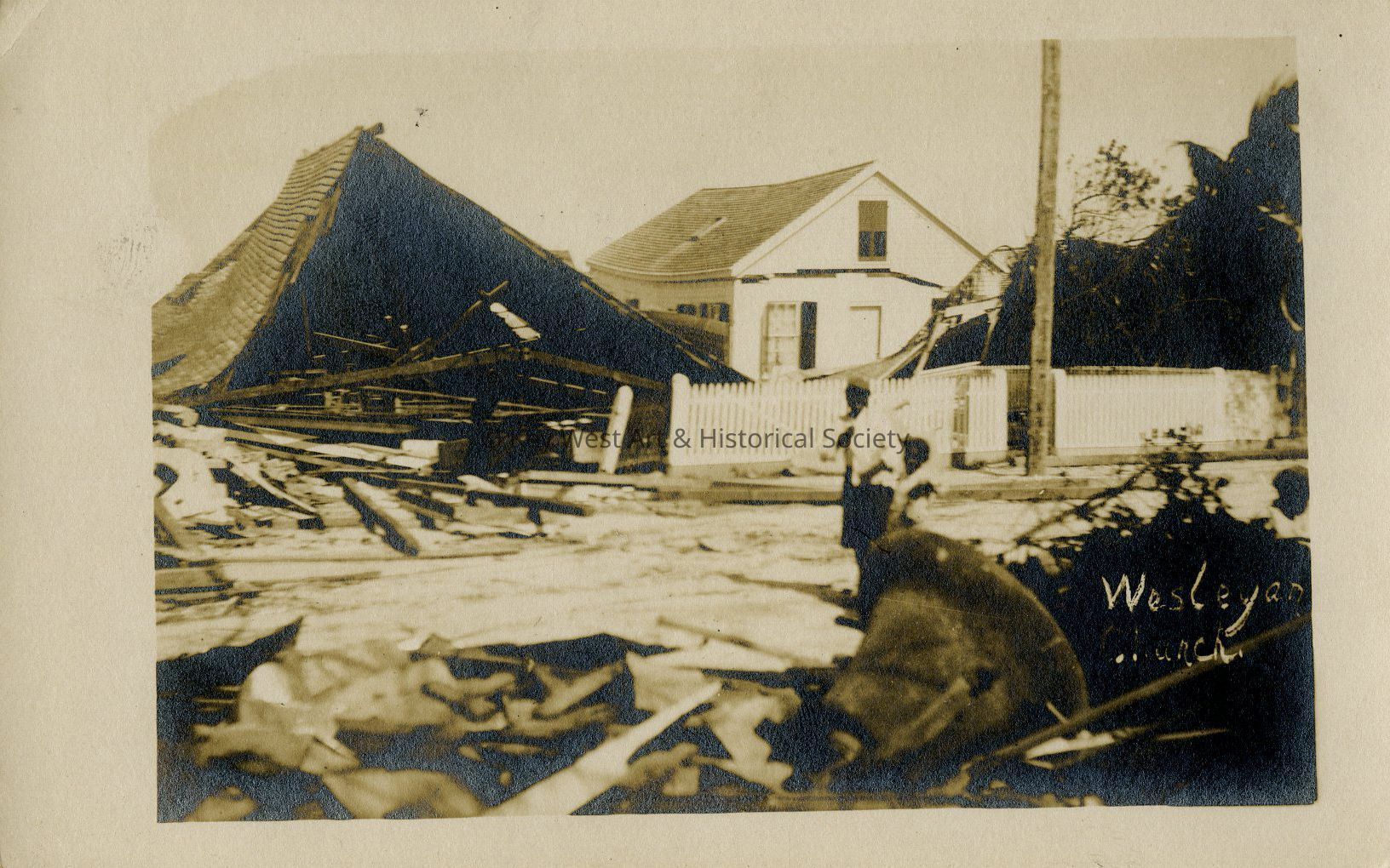 Photograph postcard depicting the destruction at the Wesleyan Church as a result of the 1909 Hurricane.