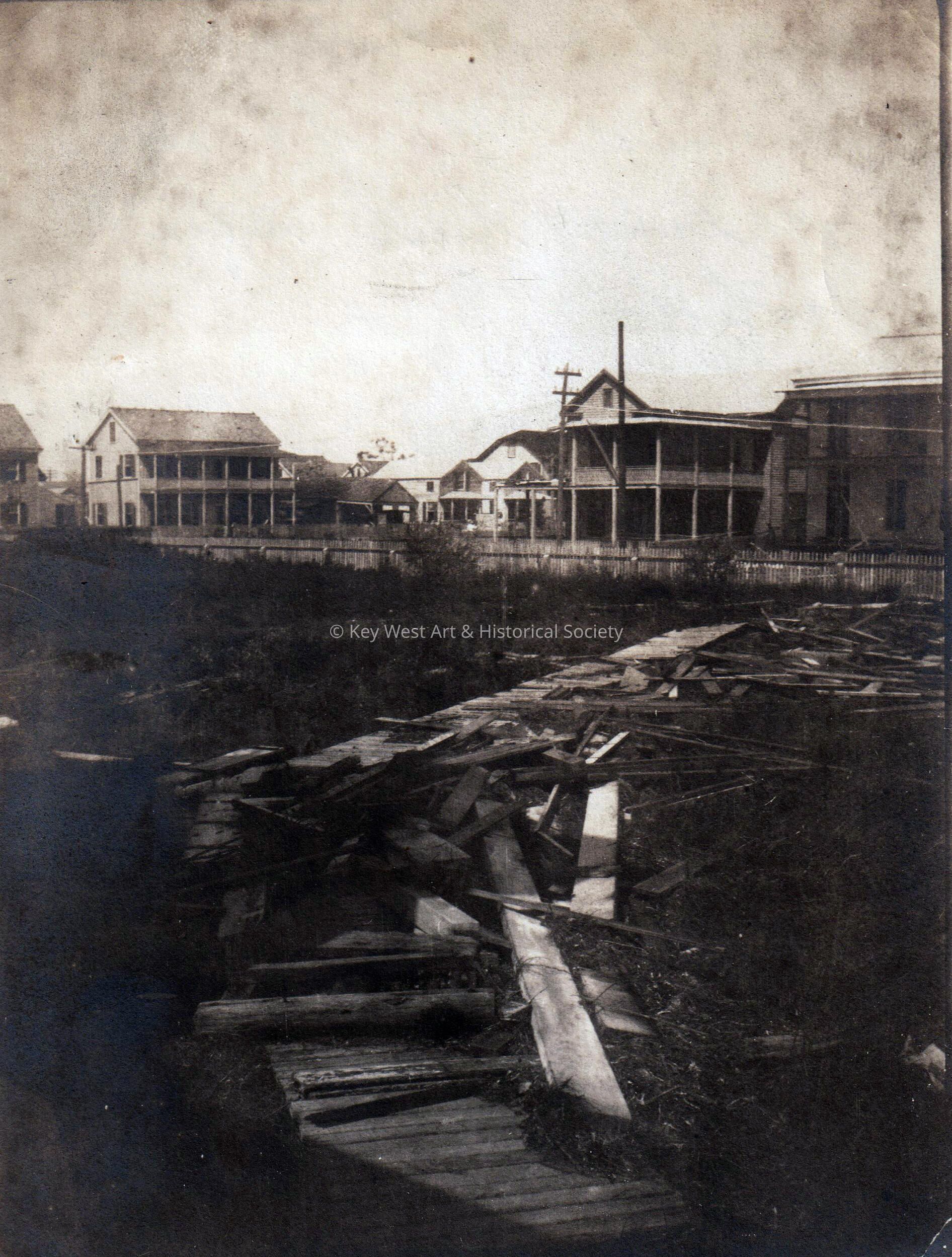 Black and white photograph of a wooden boardwalk with unknown houses in the background taken after the 1910 hurricane showing the storm damage. Noted on the verso, 'Our front walk moved 40 ft. out of line but still whole'.