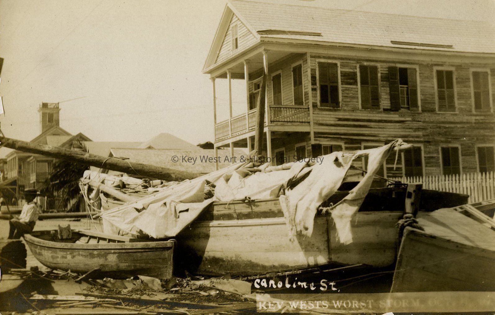 Photograph postcard depicting the destruction on Caroline Street as a result of the 1909 Hurricane.