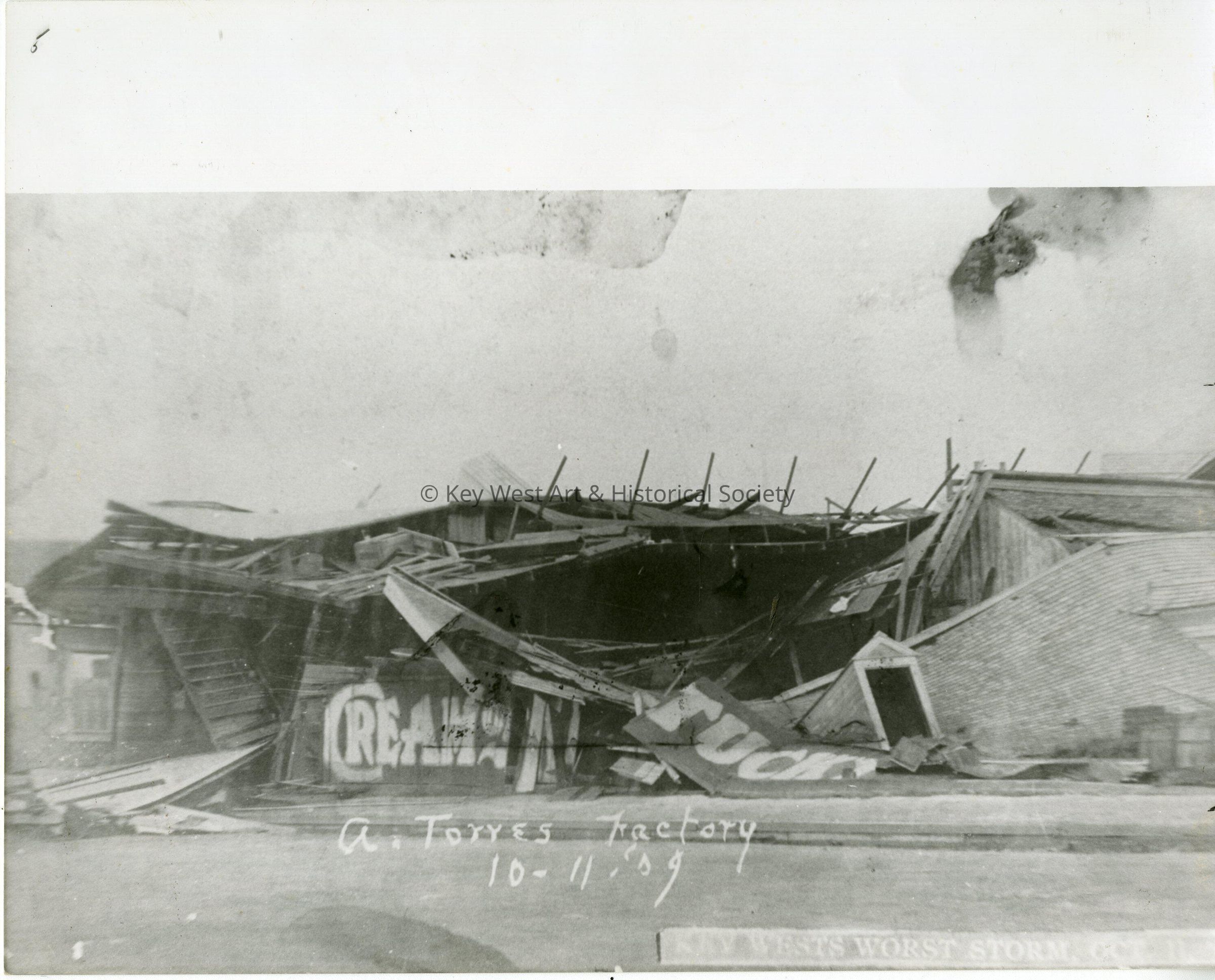 Black and white photograph of damage to the A. Torres Cigar Factory caused by the Hurricane of October 11, 1909.