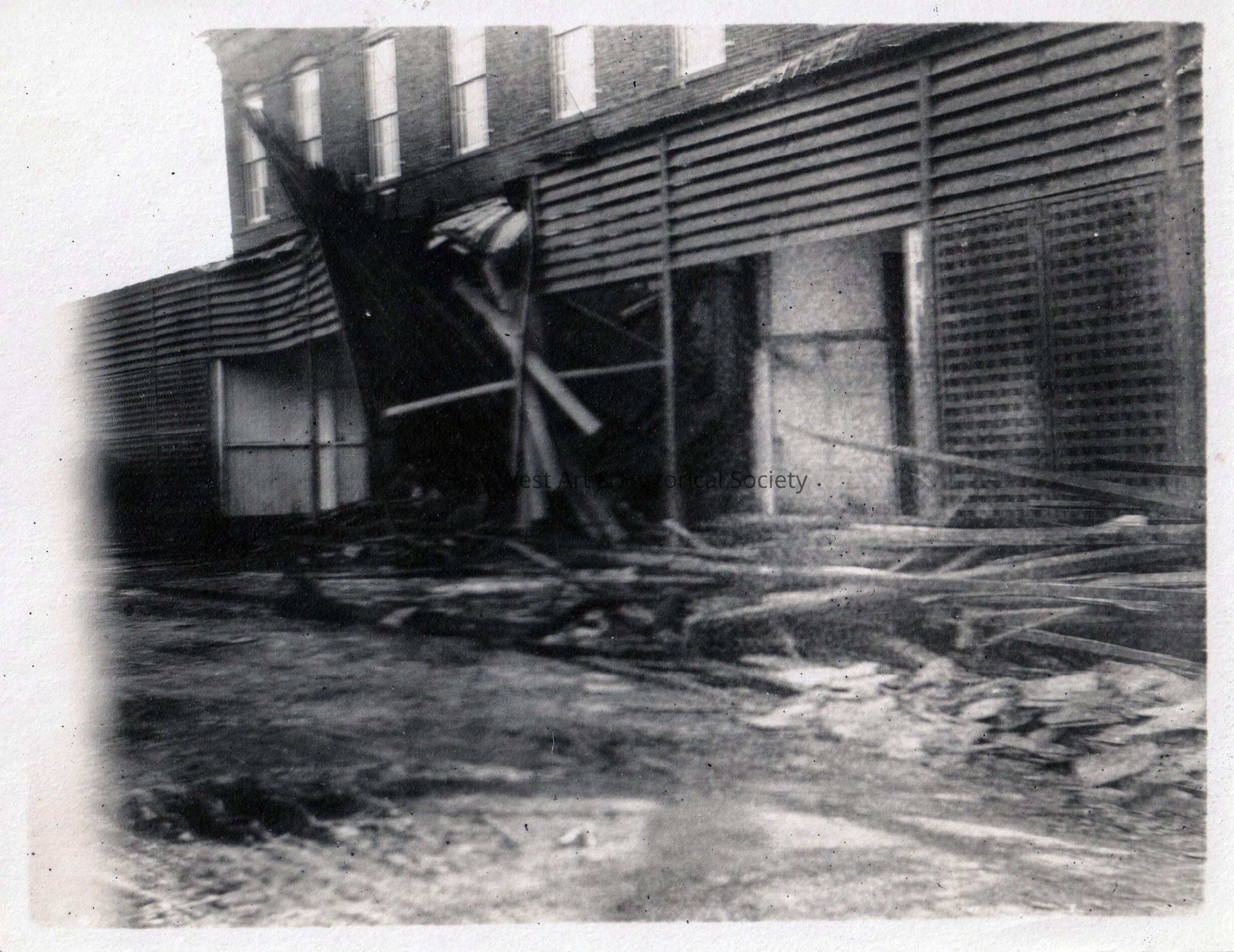 Black and white photograph of an unknown brick and wood building taken after the 1910 hurricane showing the storm damage.