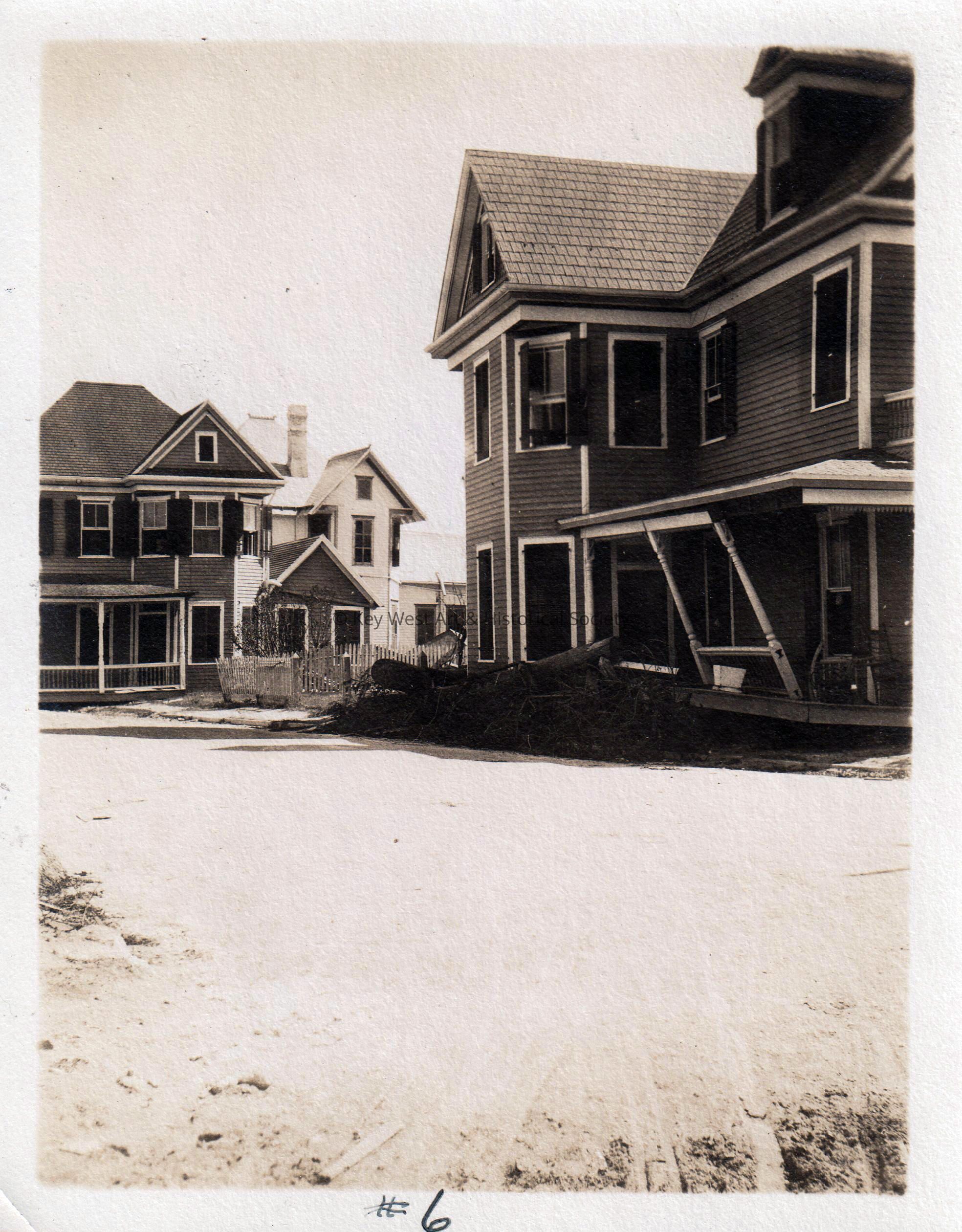 Black and white photograph of unknown houses taken after the 1910 hurricane showing storm damage.