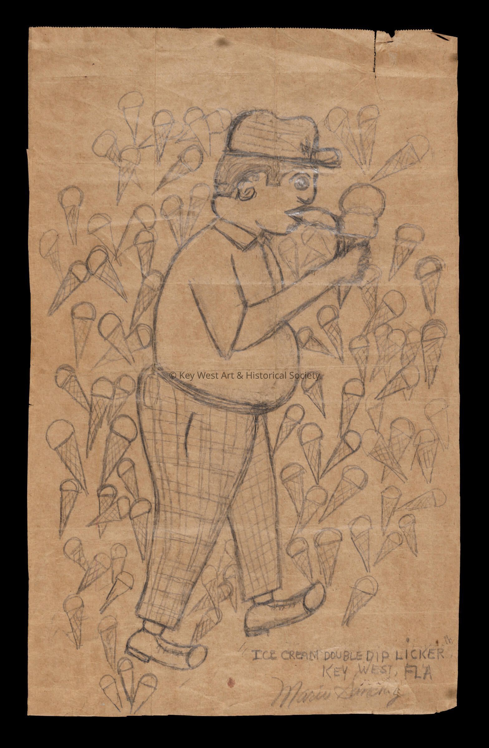 Pencil sketch on an unfolded paper bag by Mario Sanchez depicting a man eating an ice cream cone while surrounded by ice cream cones in the background.Type of Drawing