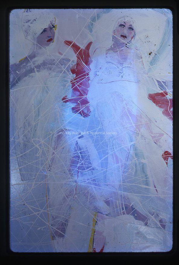35mm color slide depicting the oil on canvas painting 'Idle Gossip' by Ron Clemons. The work shows two (2) women in white, one is wearing long red gloves.