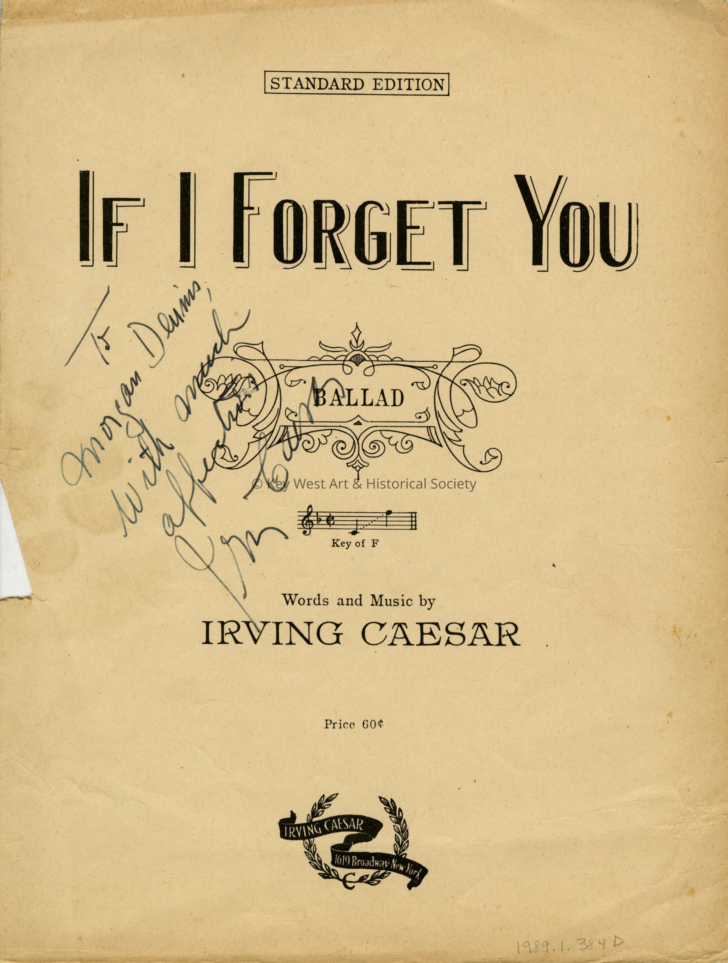 Sheet music for a song entitled 'If I Forget You' with lyrics and music by Irving Caesar. 'To Dennis Morgan with much affection, Irving Caesar' inscribed on the cover.