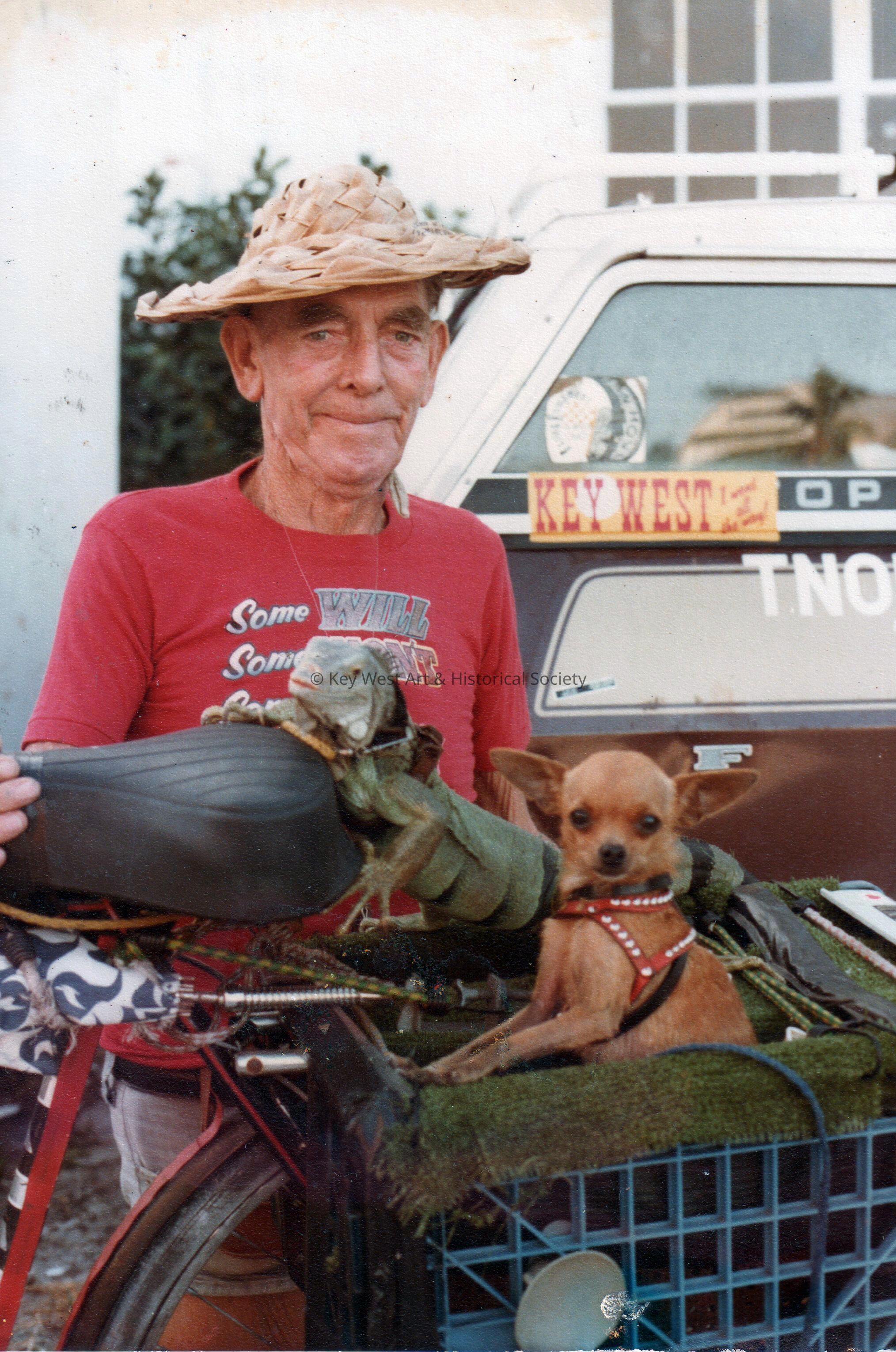 Iguana Man with Iguana and dog.