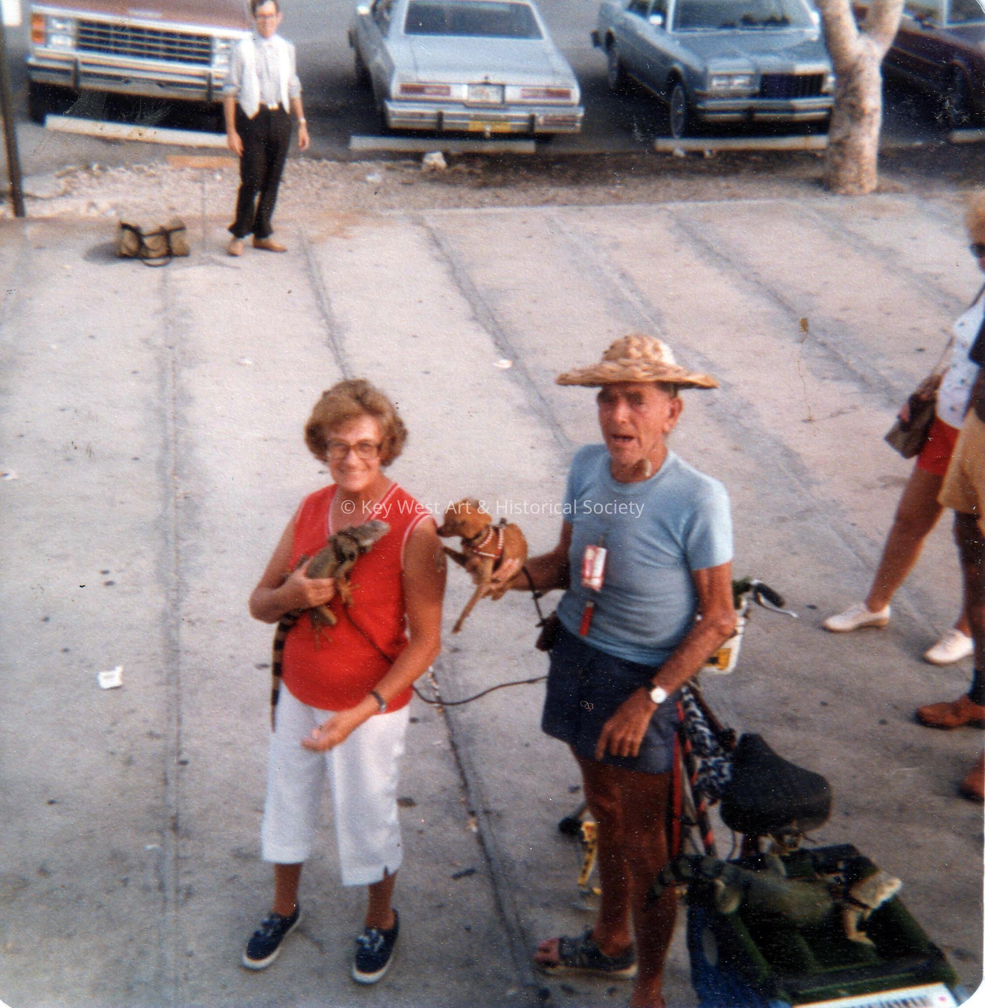Color photograph of Iguana Man and an unknown woman on the dock at Mallory Square.