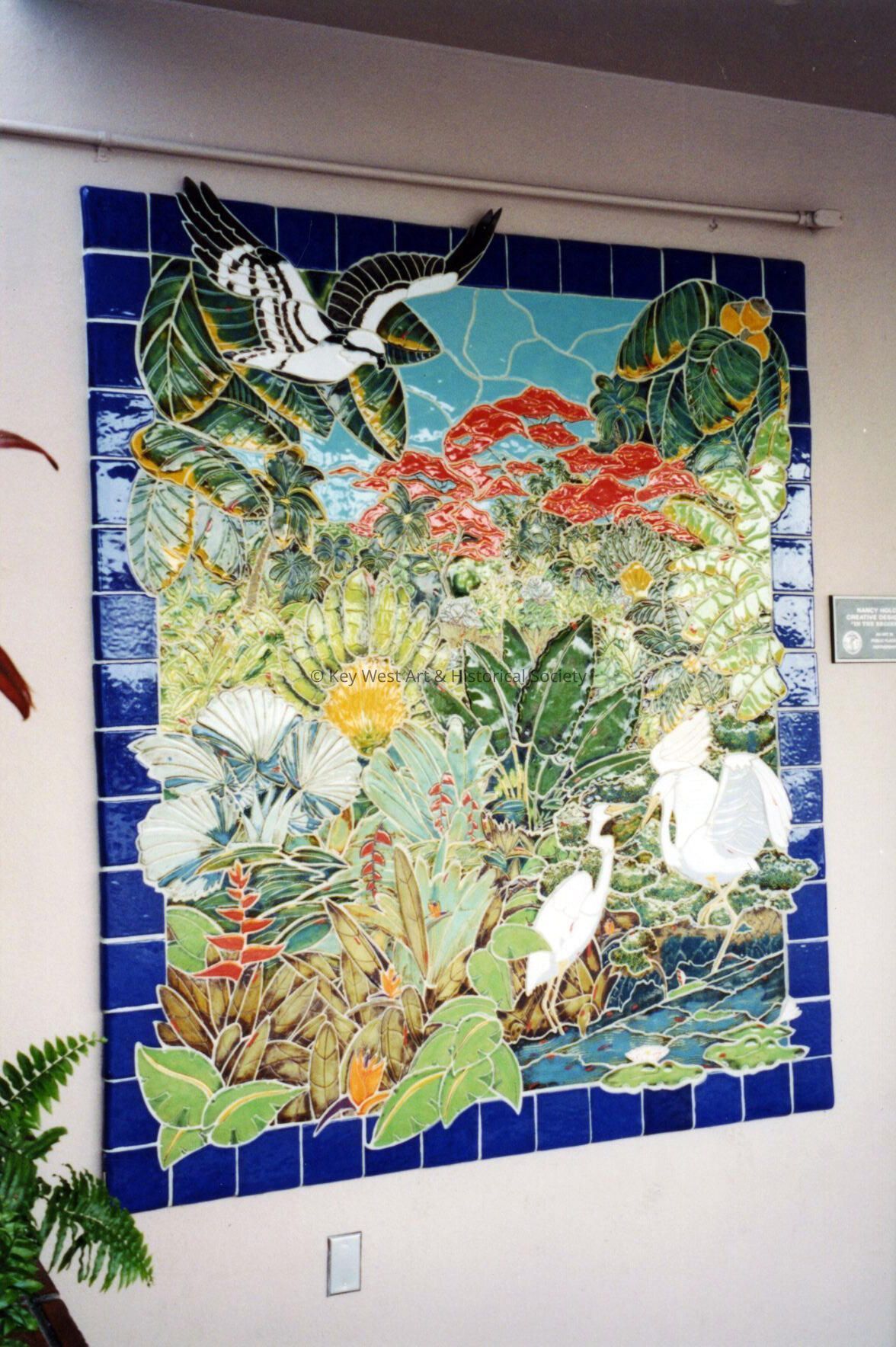 Color photograph taken by historian James M. Goode of a ceramic mural at the Key West Airport entitled 'In the Beginning' by Nancy Holcomb during a trip to Key West in August 2001. Printed from Roll 17.