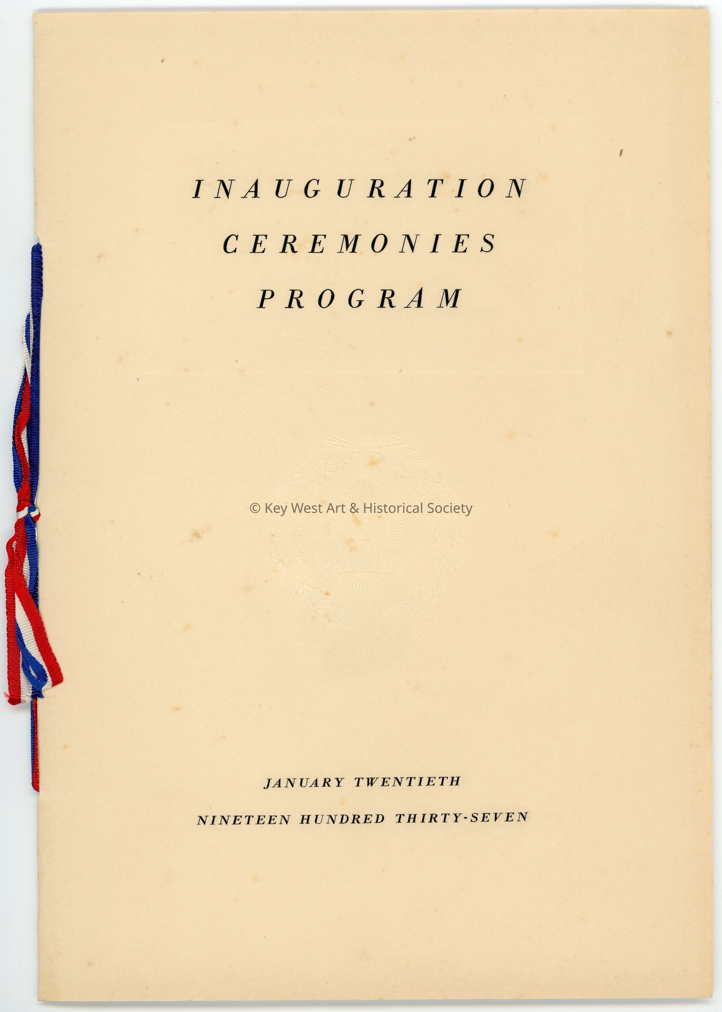 A program for the inauguration of Franklin Delano Roosevelt on January 20th, 1937. The program is bound together by red, white, and blue ribbon.Collection