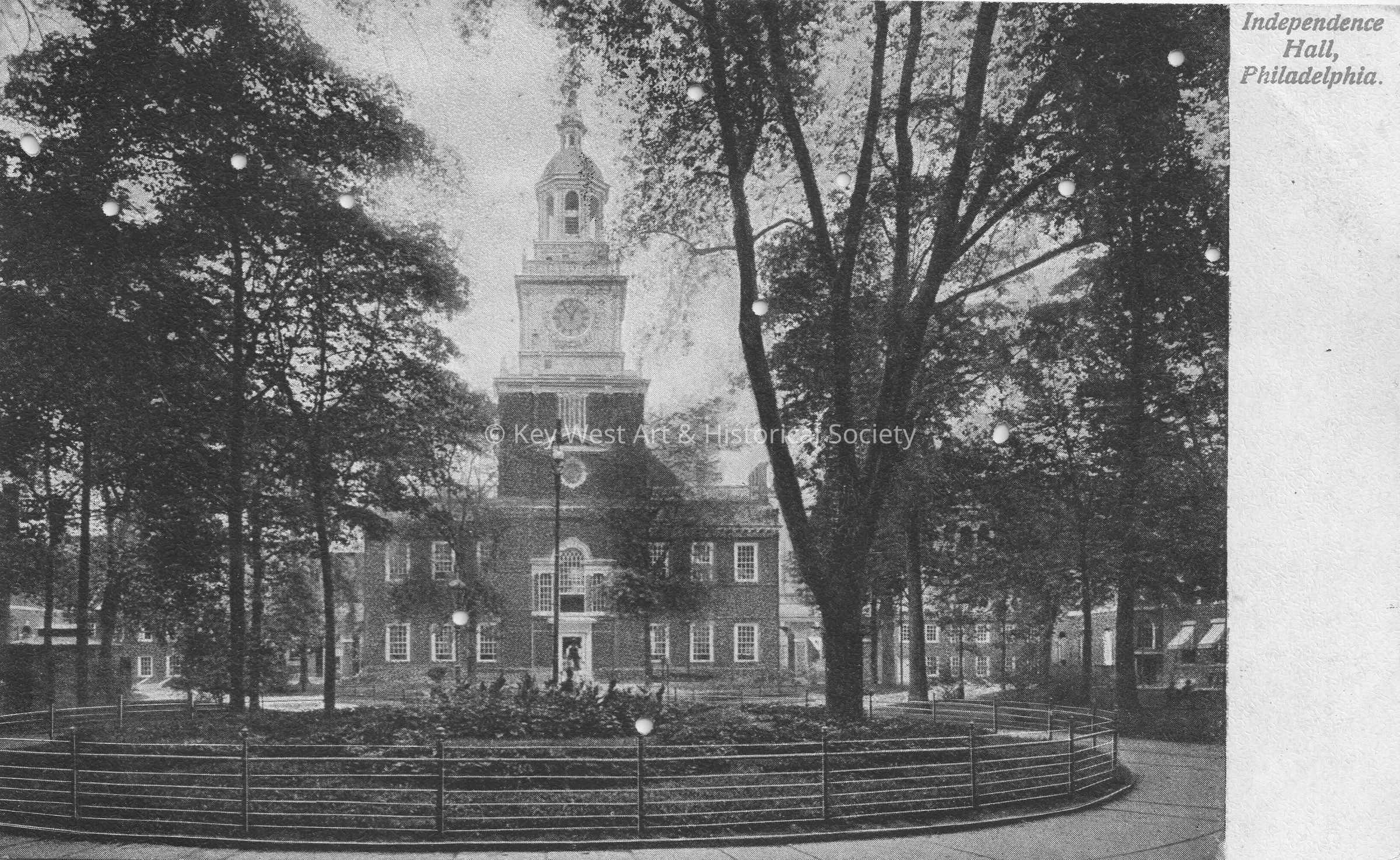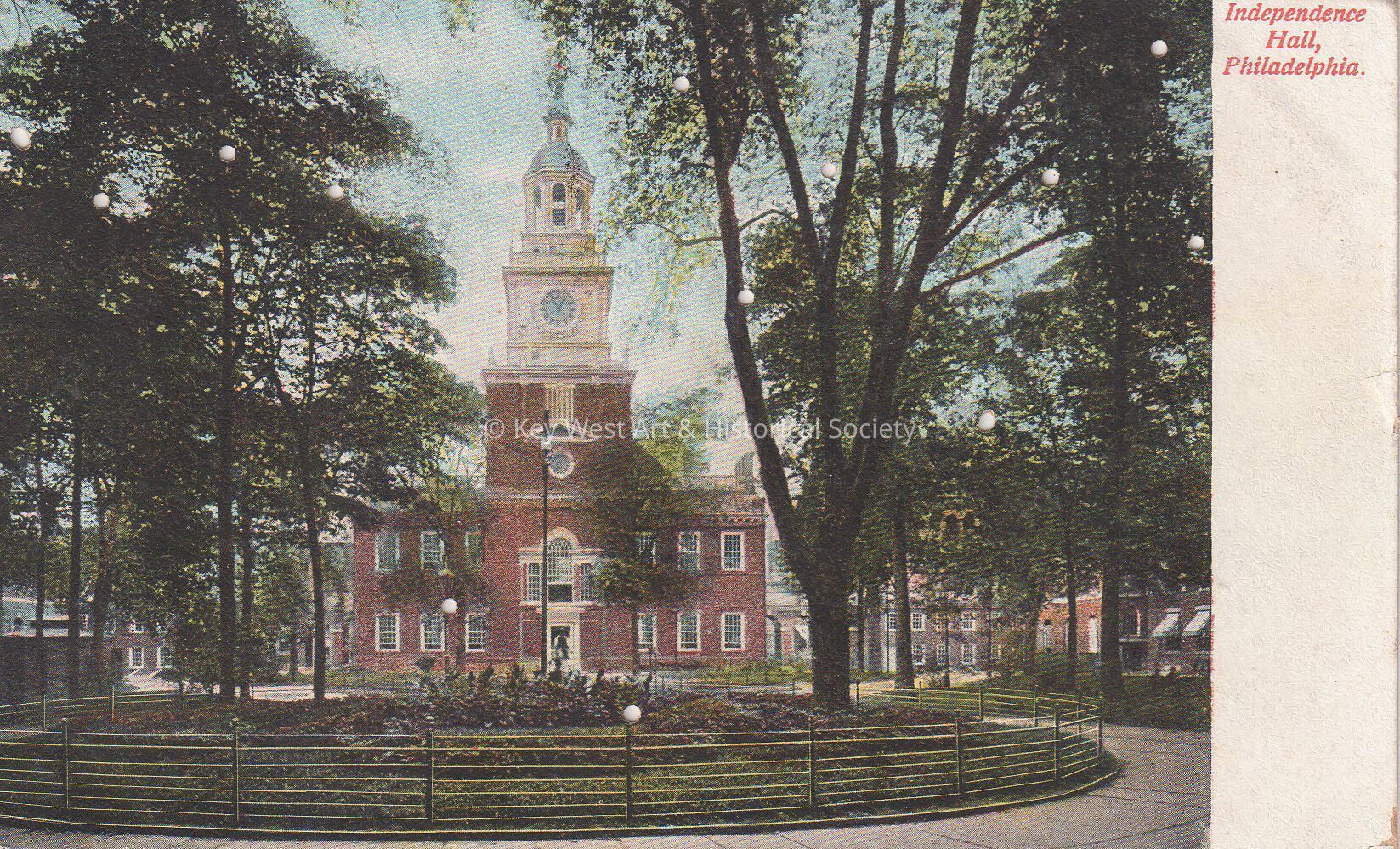 Postcard depicting a large building with a clock-tower. The caption reads, ‘Independence Hall, Philadelphia.’Collection