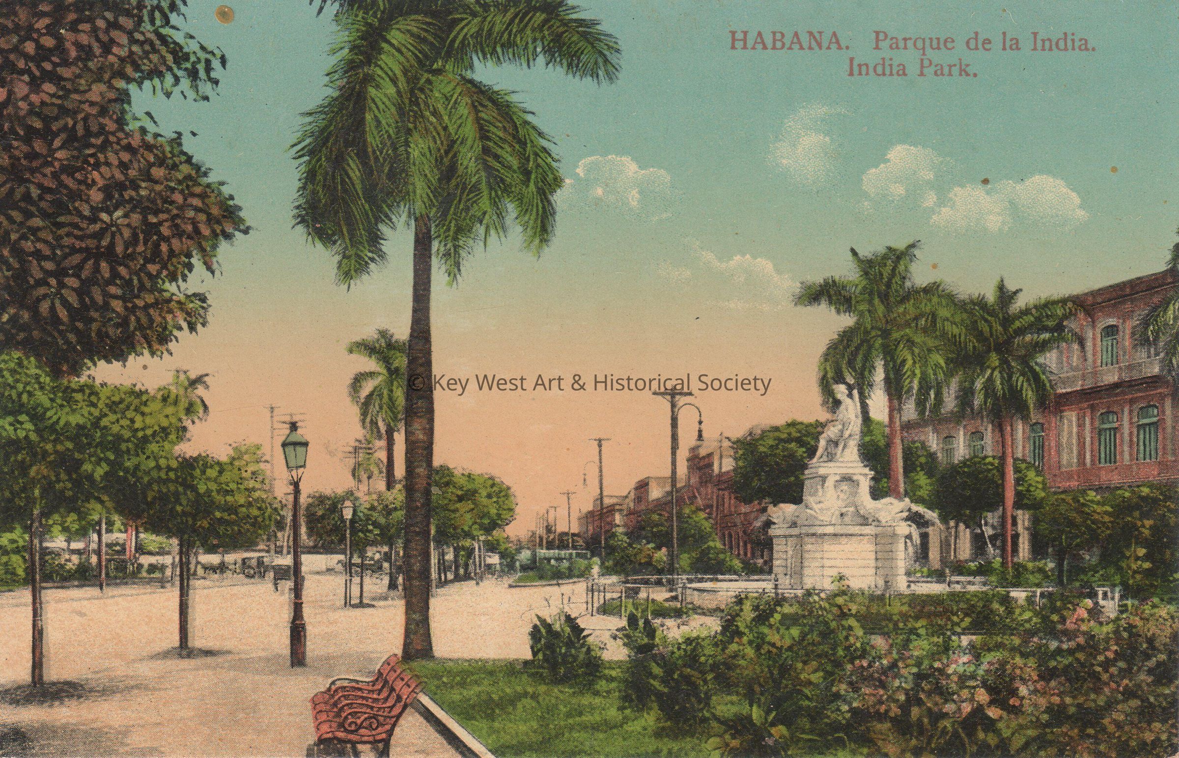 Postcard depicting a city park with a statue. The caption reads, ‘Habana. Parque de la India. India Park.’Subject Place