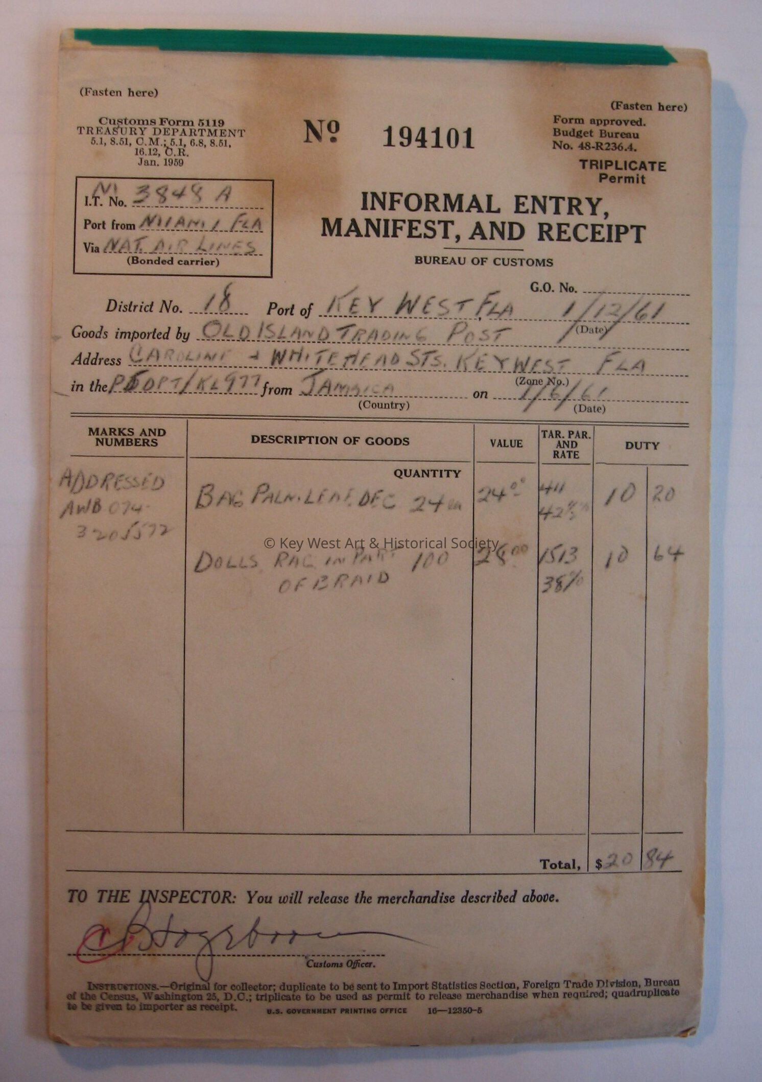Bound eighteen pages of U.S. Customs forms and receipts. Form one to Old Island Trading Post from Jamaica. Form two to Mrs. R.W. Wood from Pakistan. Form three to Old Island Trading Post from Haiti. Form four to Carl Johnson from unknown. Form five to John Walter Houck from Mexico. Form six to Harold E. Van Niman from unknown. Form seven to Old Island Trading Post from France. Form eight to CO HMCS Sigul from Canada. Form nine to Old Island Trading Post from Haiti. Form ten to Arturo Jesus Fonseca from Cuba, Form eleven to Mario Nunez Gomez from Cuba. Form twelve to Jose Enrico Nunez from Cuba. Form thirteen to Jose Garrote from Cuba. Form fourteen to Old Island Trading Post from Germany. Form fifteen to J.W Weatherford from Japan. Form sixteen to Old Island Trading Post from Switzerland. Form seventeen to Peruvian Sub Abtad from Peru. Form eighteen to Mr. and Mrs. John Spottswood from Bermuda.Collection