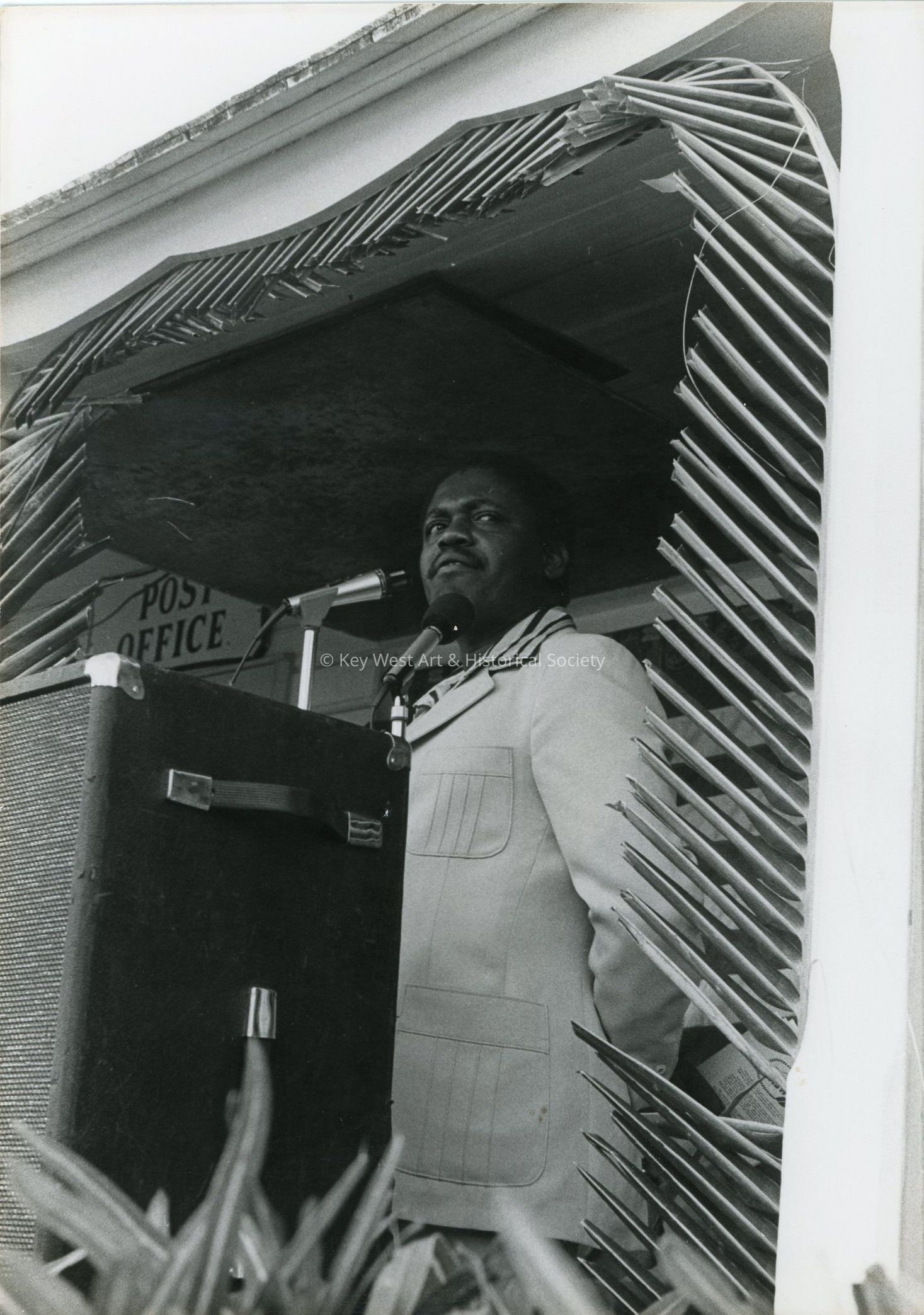 Black and white photograph of insert name giving a speech in front of the Key West Post Office.